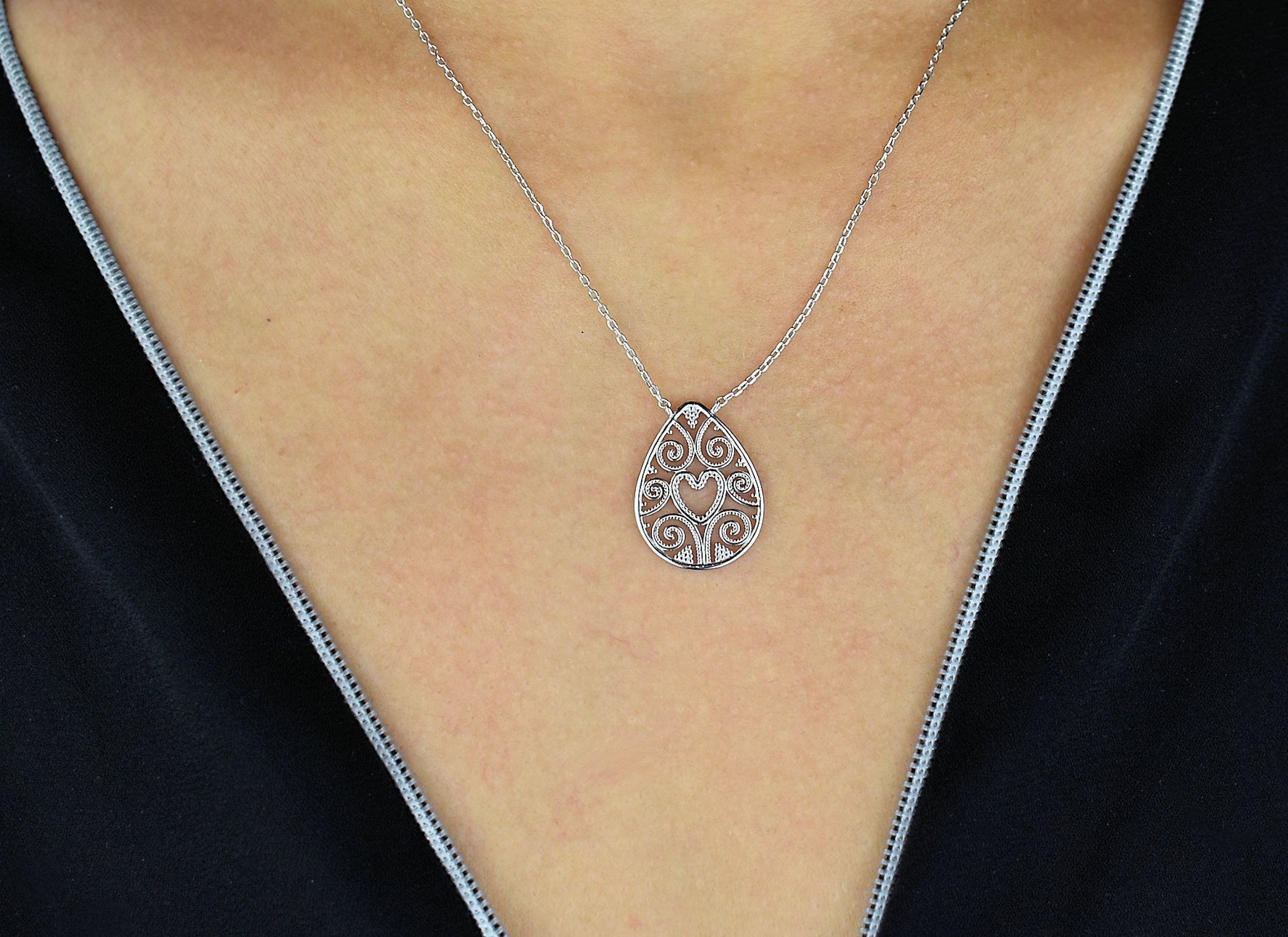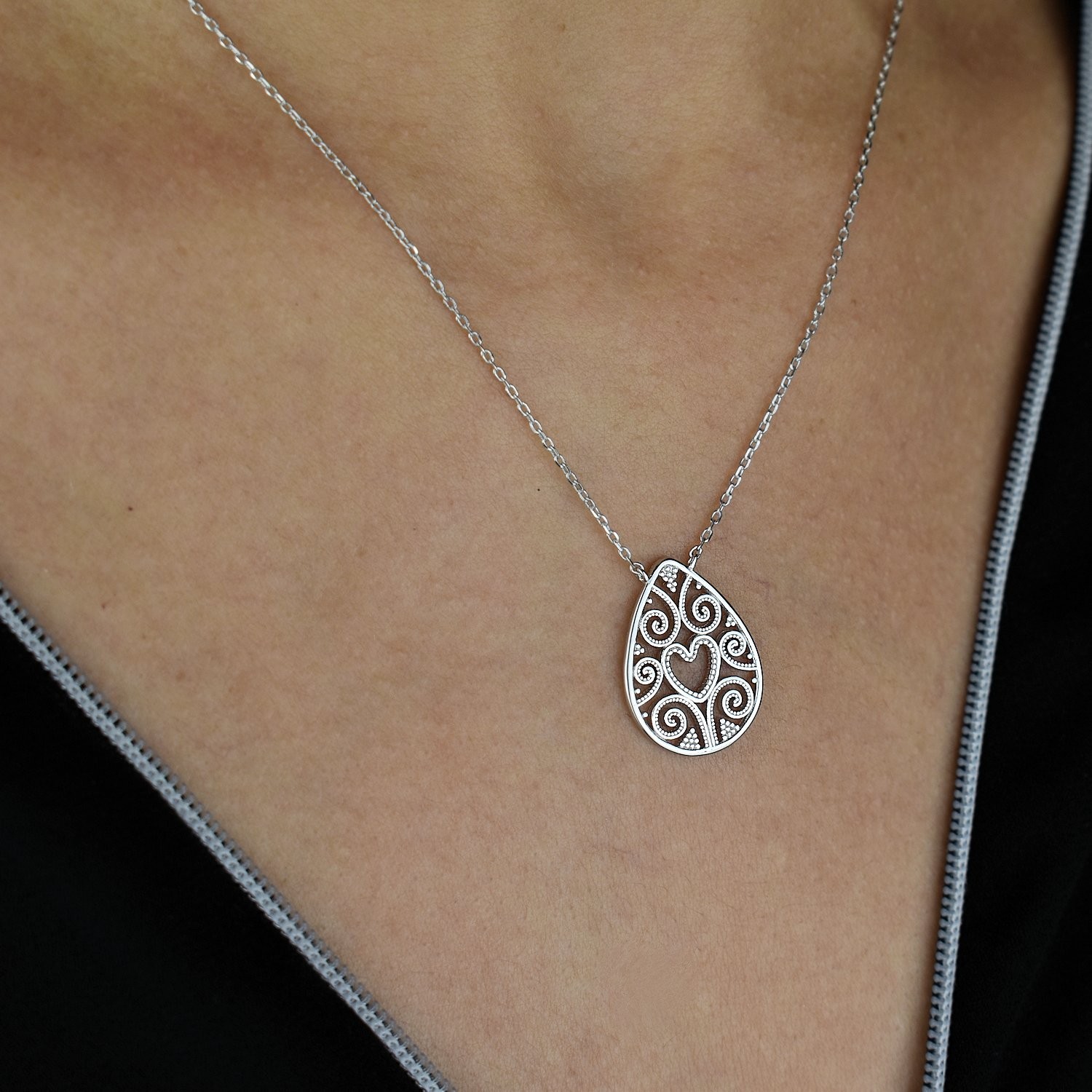 Un collier coeur goutte arabesque argent 925 d’une délicatesse architecturale