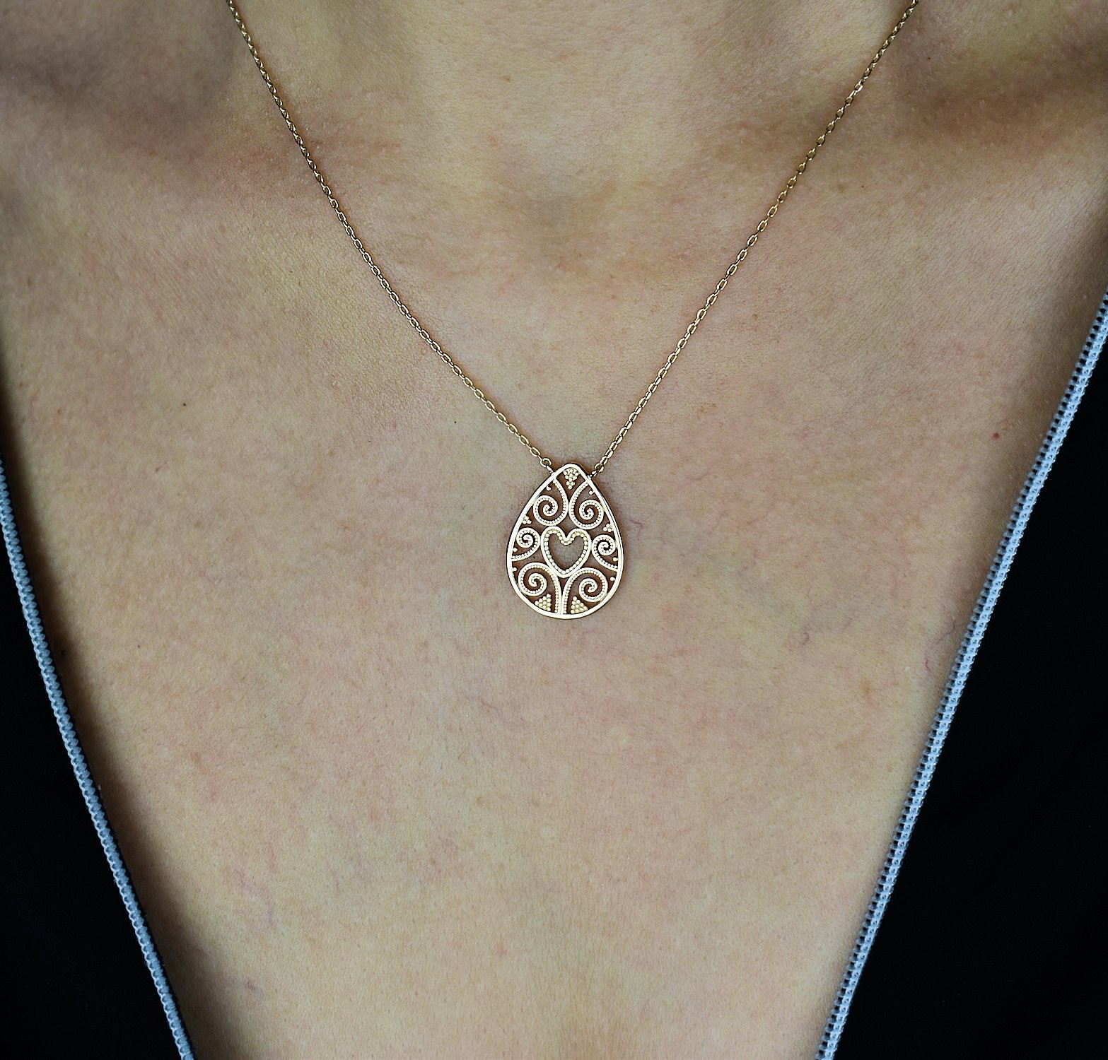 Ce collier exceptionnel arbore un superbe pendentif cœur goutte ovale avec une arabesque ciselée, ajoutant une touche d'élégance et de raffinement à votre décolleté.
