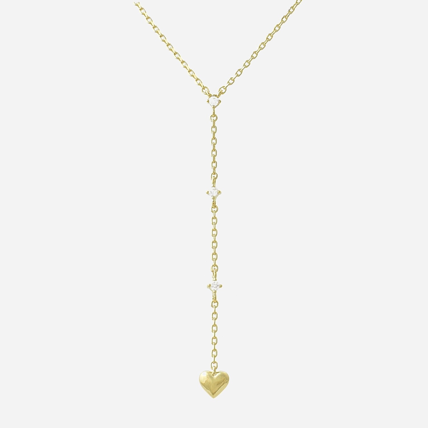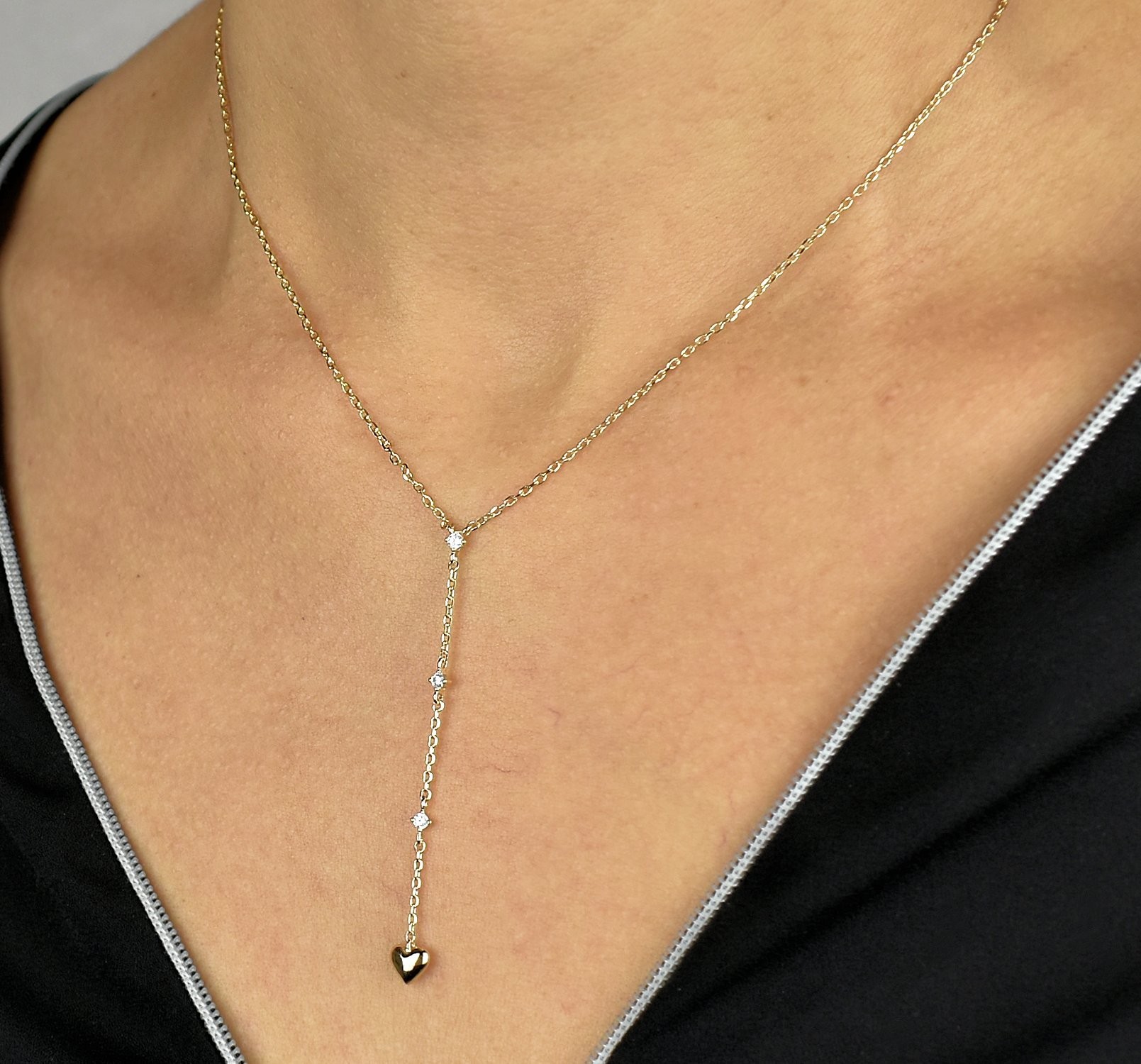 Le collier forme Y crée une ligne élégante qui sublime le décolleté, tandis que le cœur serti de zirconium étincelant apporte une touche lumineuse. Ce design cravate allie sophistication intemporelle et modernité, pour un bijou qui se démarque avec délicatesse.