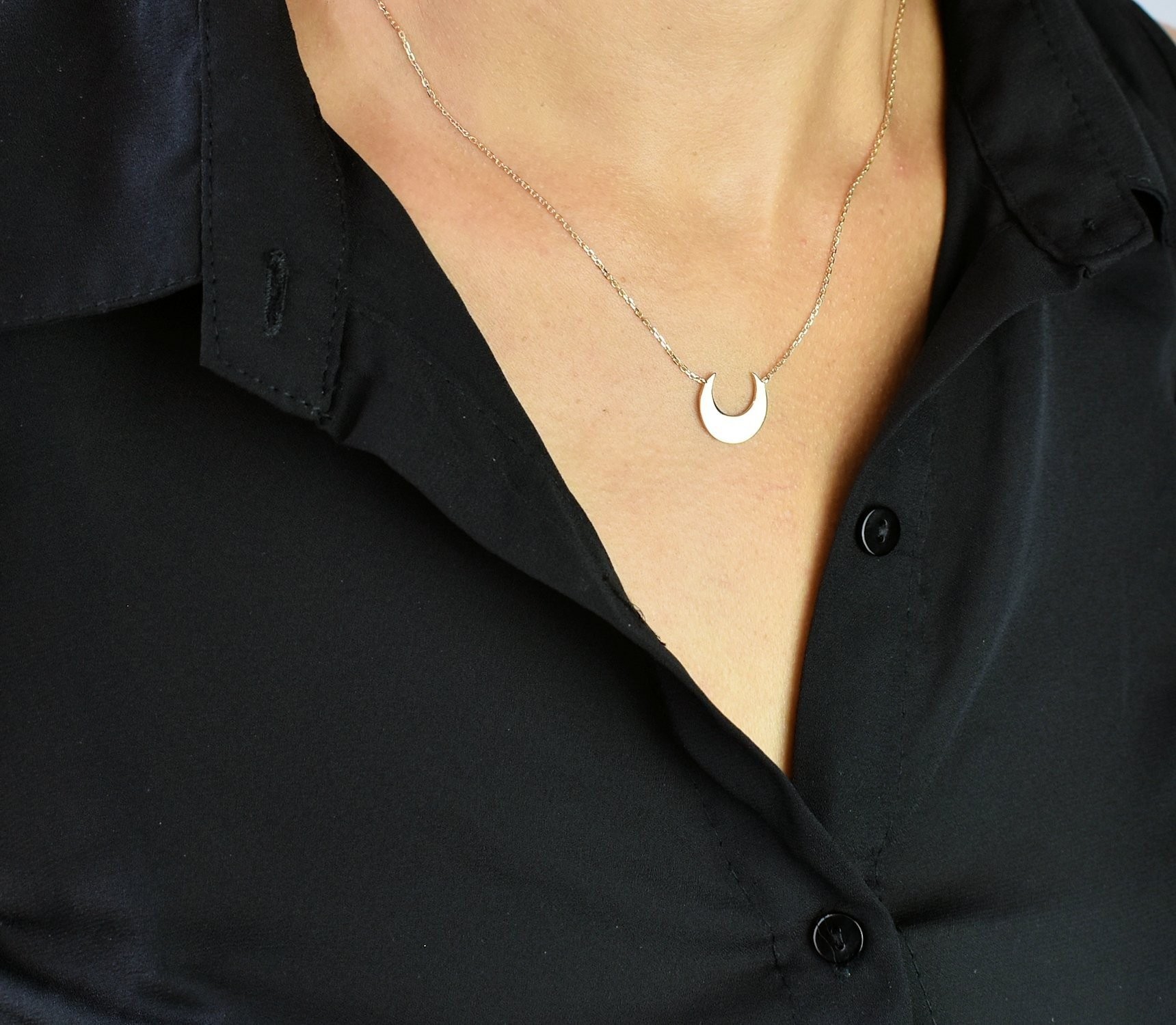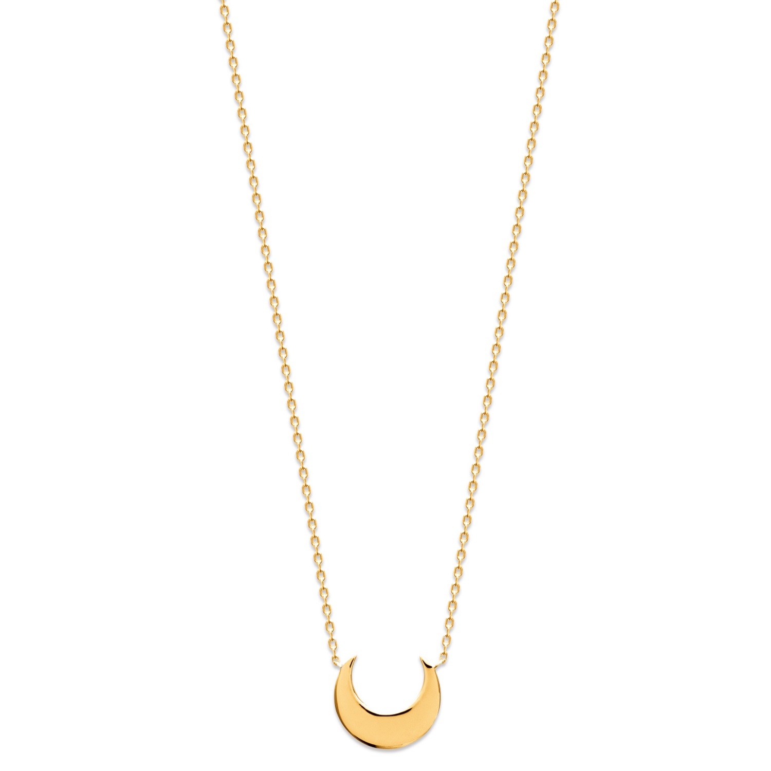 Le croissant de lune épuré suspendu à une chaîne délicate plaqué or 750 – 3 microns. La lune, généralement associée à la féminité et au cycle de la vie comme son compagnon le soleil, offre un champ symbolique extrêmement vaste : transformation, intuition, renouveau.