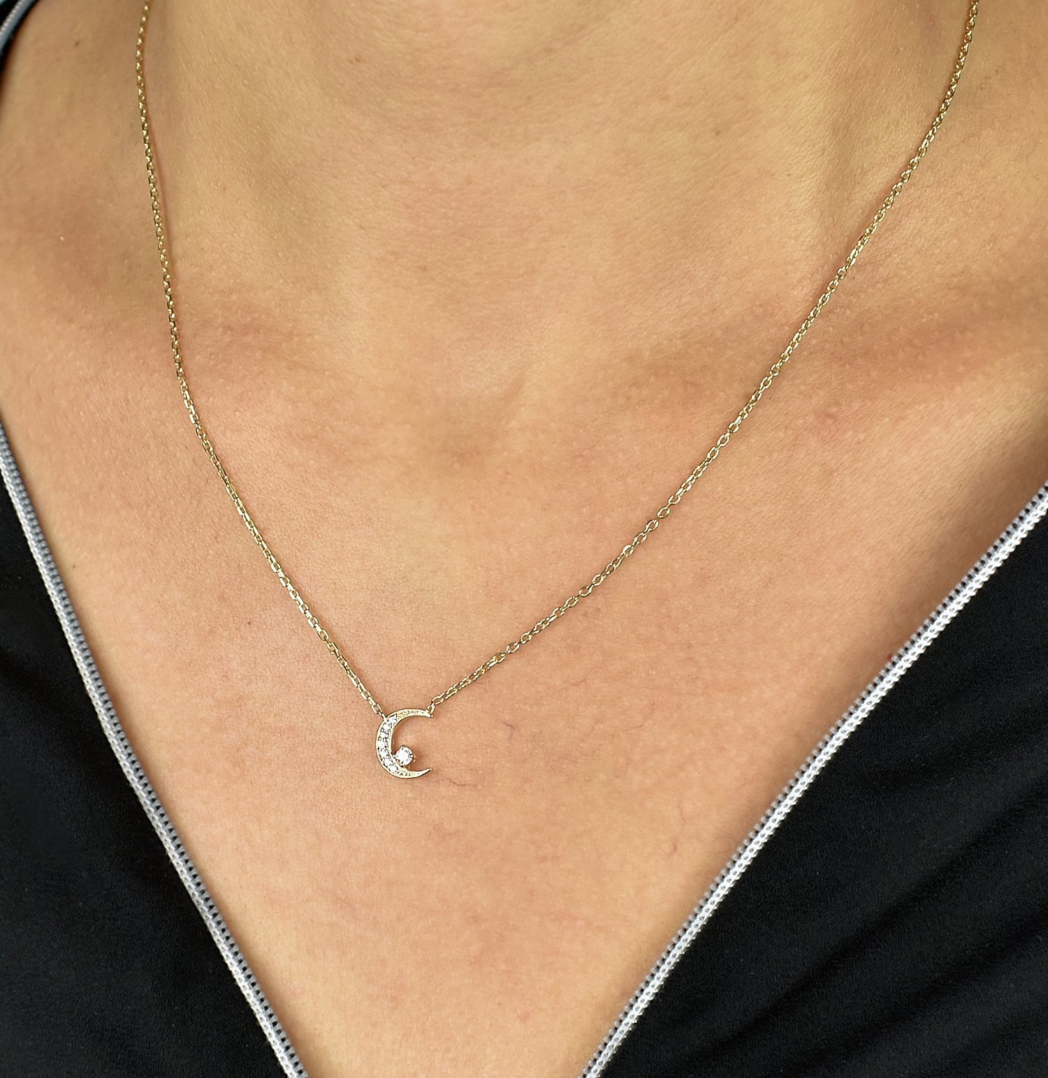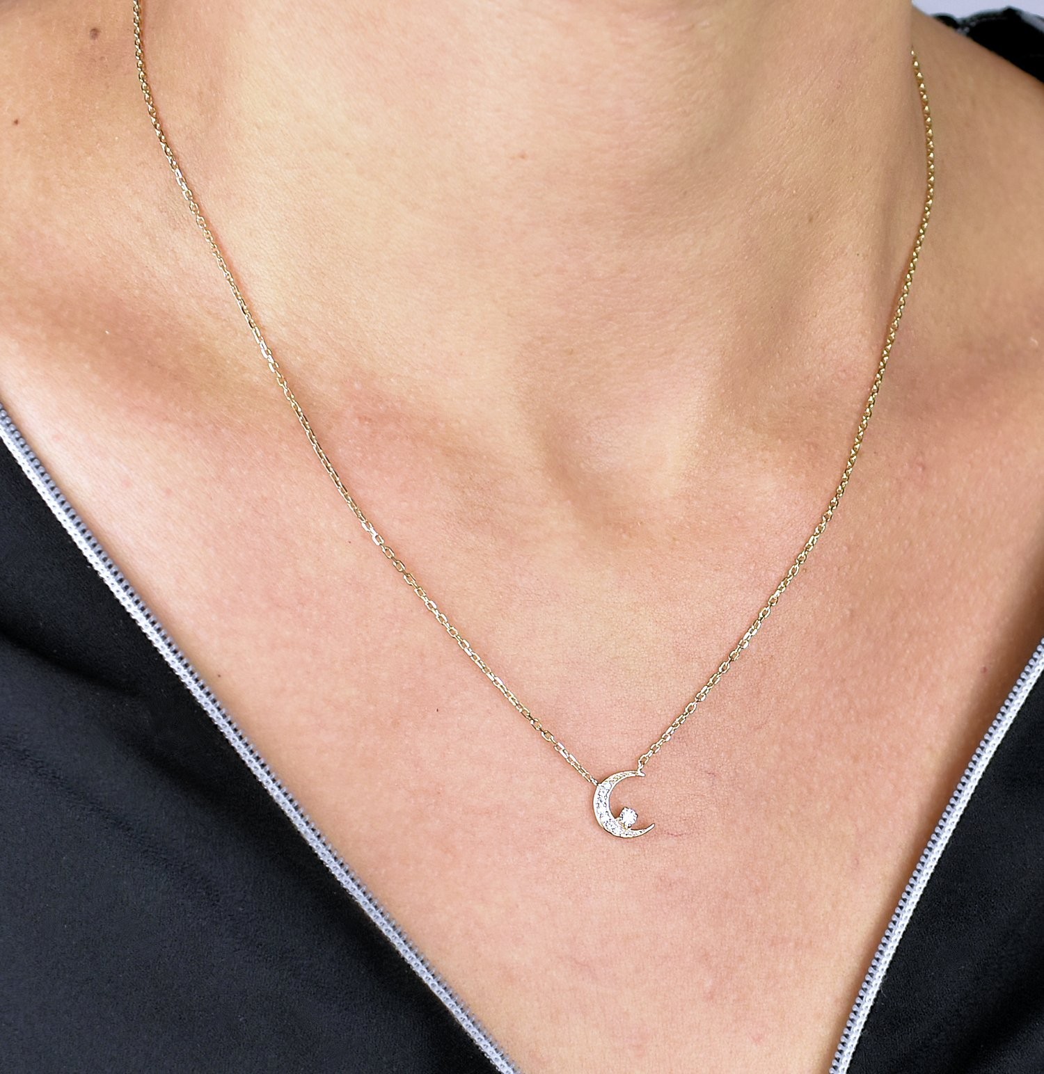 Le croissant de lune orné d’un oxyde de zirconium scintillant, suspendu à une chaîne plaqué or 750 – 3 microns. La lune, généralement associée à la féminité et au cycle de la vie comme son compagnon le soleil, porte en elle un champ symbolique extrêmement vaste : renaissance, intuition, mystère.
