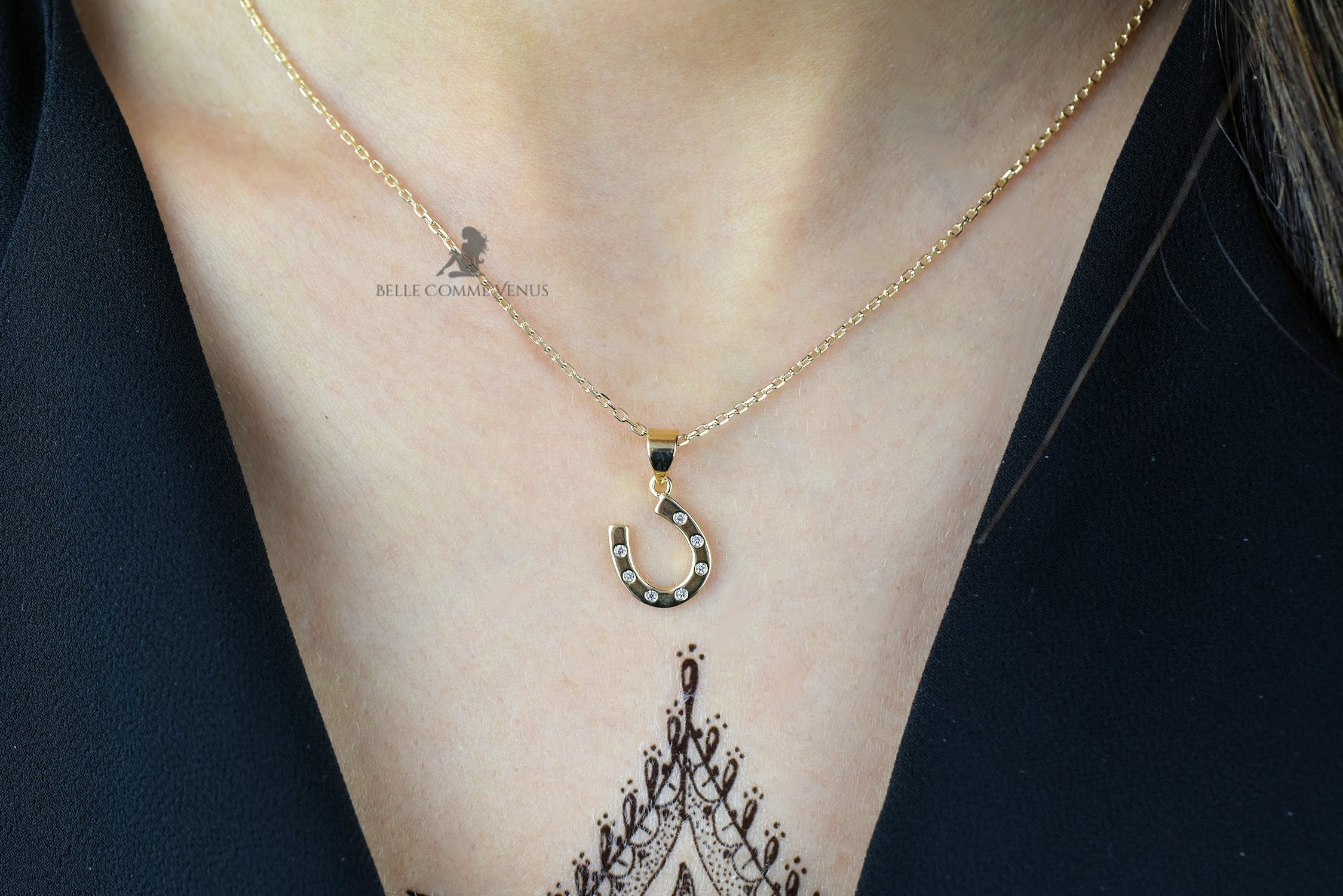 Collier fer à cheval plaqué or oxyde zirconium porte bonheur : chance scintillante