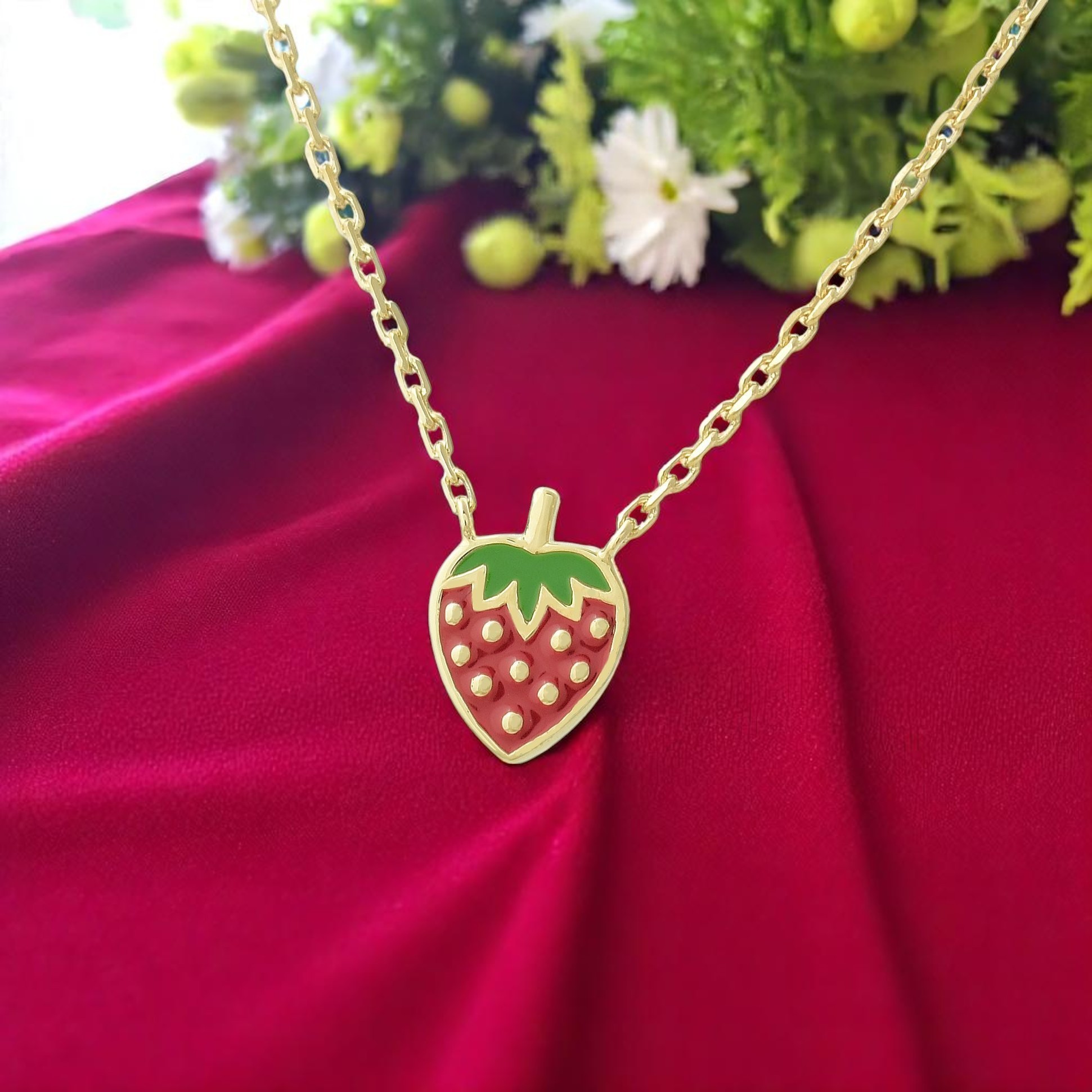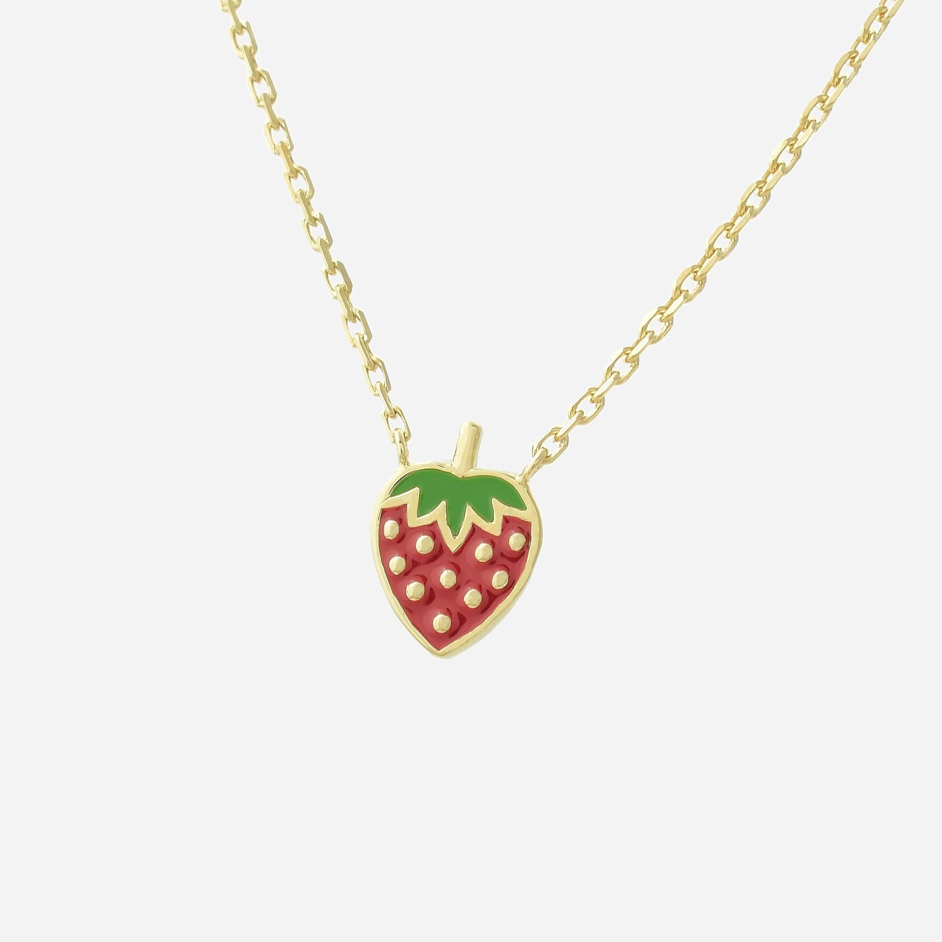 Collier fraise plaqué or émail coloré enfant : douceur gourmande au cou