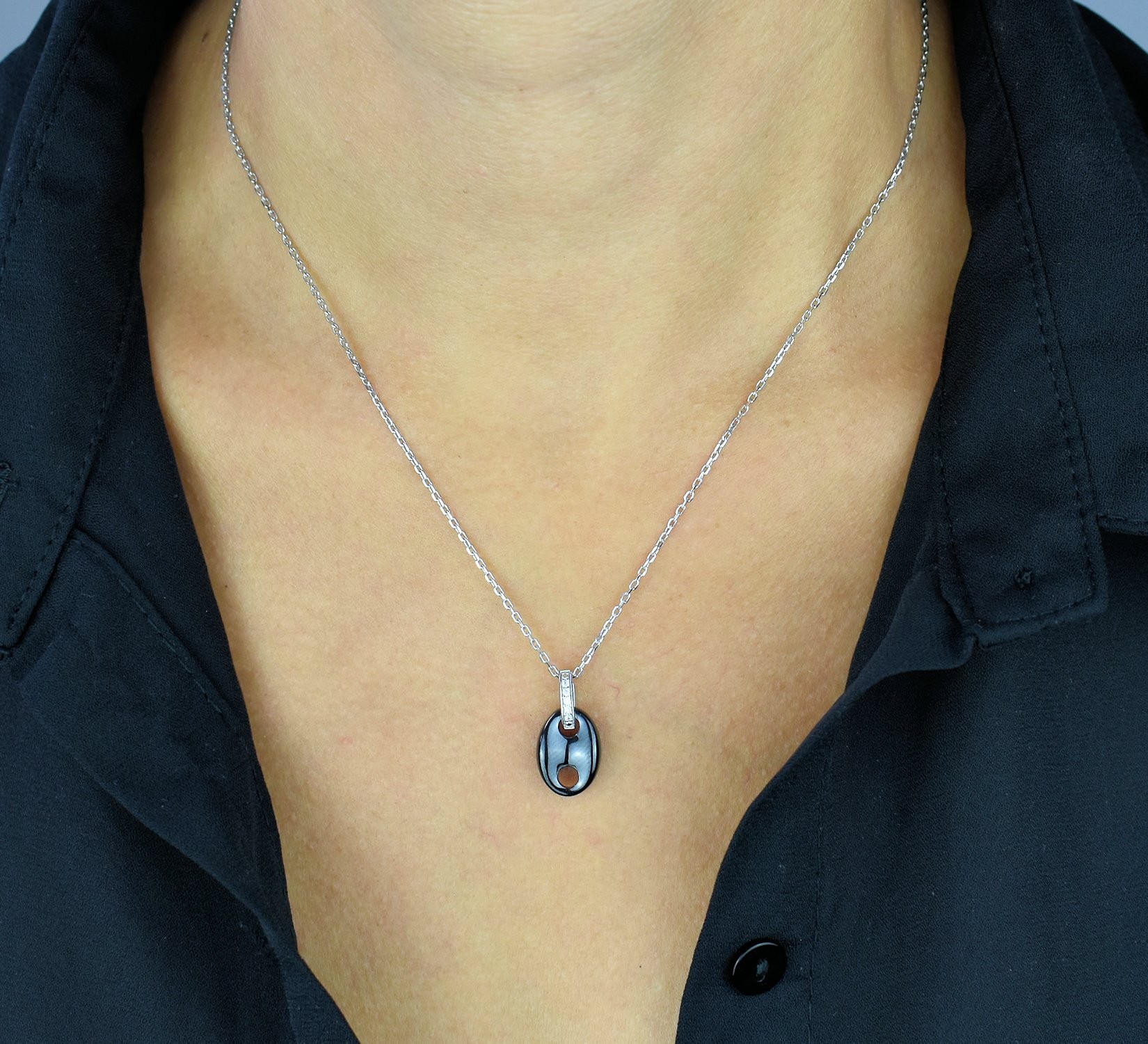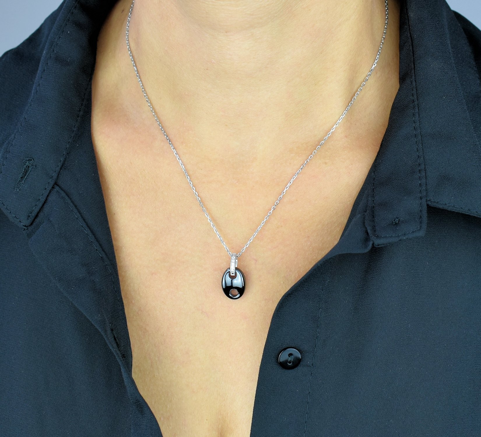 Ce collier grain café argent 925 rhodié revisite le motif iconique du grain de café avec céramique et oxyde de zirconium. L’argent 925 rhodié garantit une finition miroir éclatante et un métal hypoallergénique qui traverse le temps sans ternir.