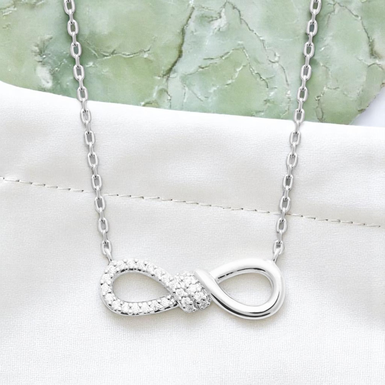 Le symbole de l’infini, représentant l’éternité, l’amour sans fin et l’harmonie, est magnifiquement rehaussé par l’éclat des oxydes de zirconium. Ce collier allie une signification profonde à une élégance intemporelle, en faisant une pièce précieuse pour toutes les occasions.