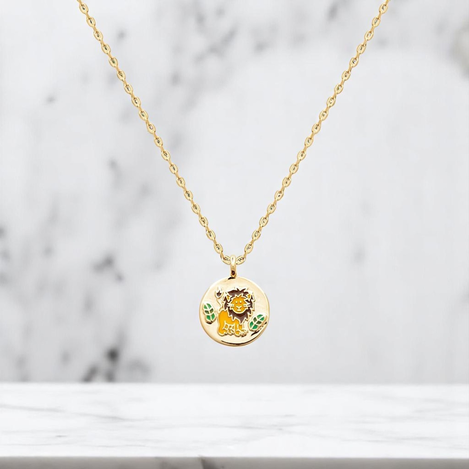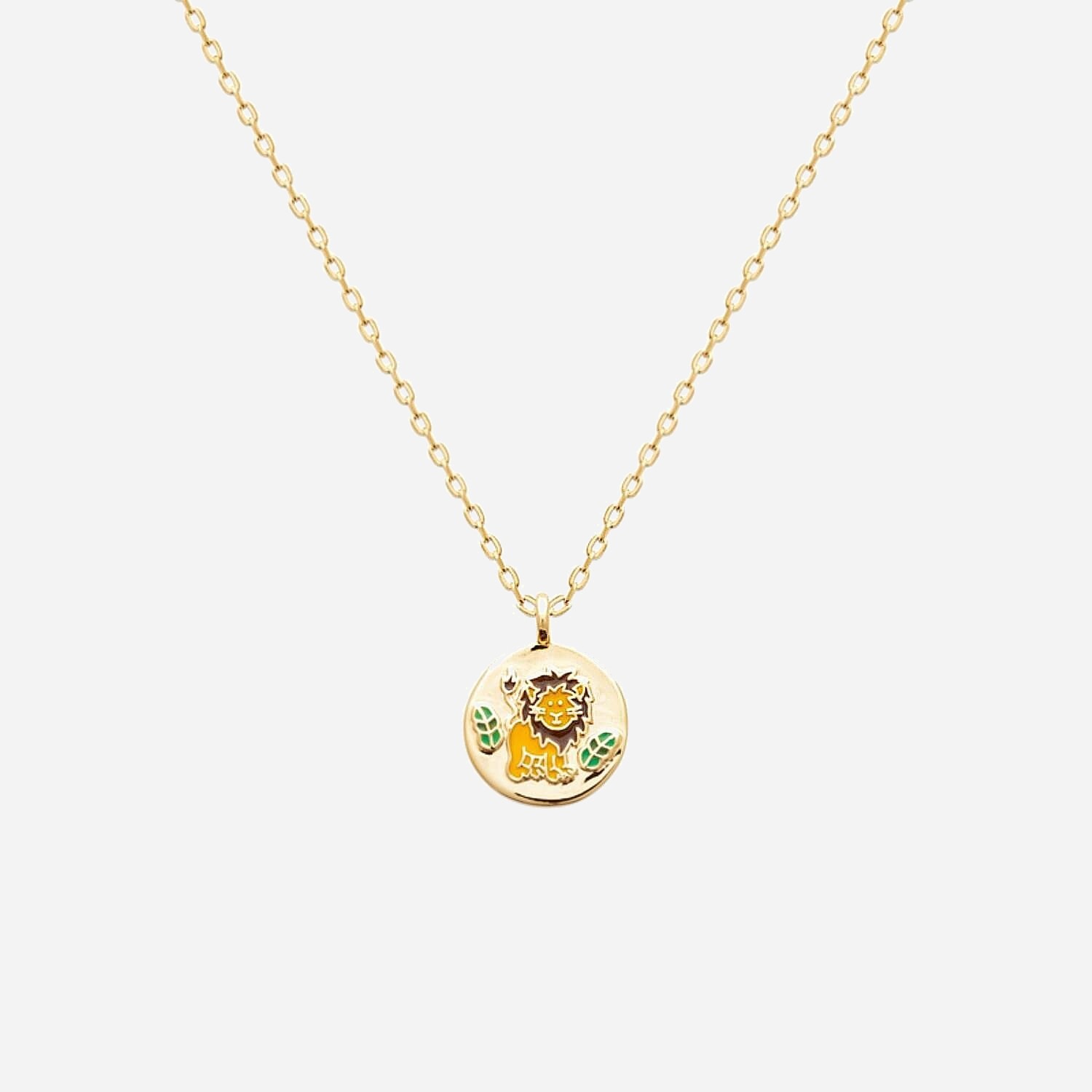 Découvrez la symbiose entre force et nature avec le collier lion et petites feuilles émail coloré plaqué OR 750 3 microns, une création extraordinaire pour les enfants.
