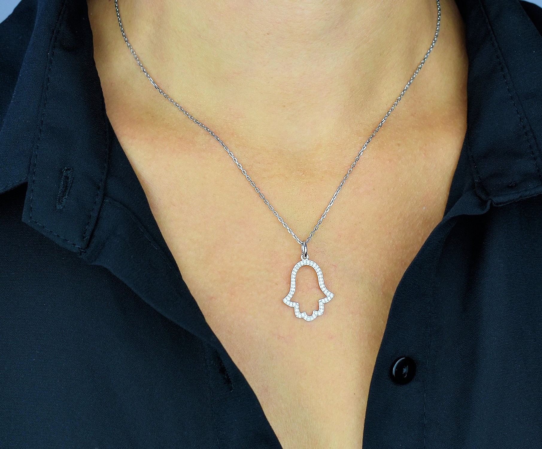 Ce collier main fatma argent 925 rhodié célèbre l’ancestral symbole de protection avec son design ajouré délicat serti d’oxydes de zirconium étincelants. L’argent 925 rhodié garantit une finition miroir éclatante et un métal hypoallergénique qui traverse le temps.