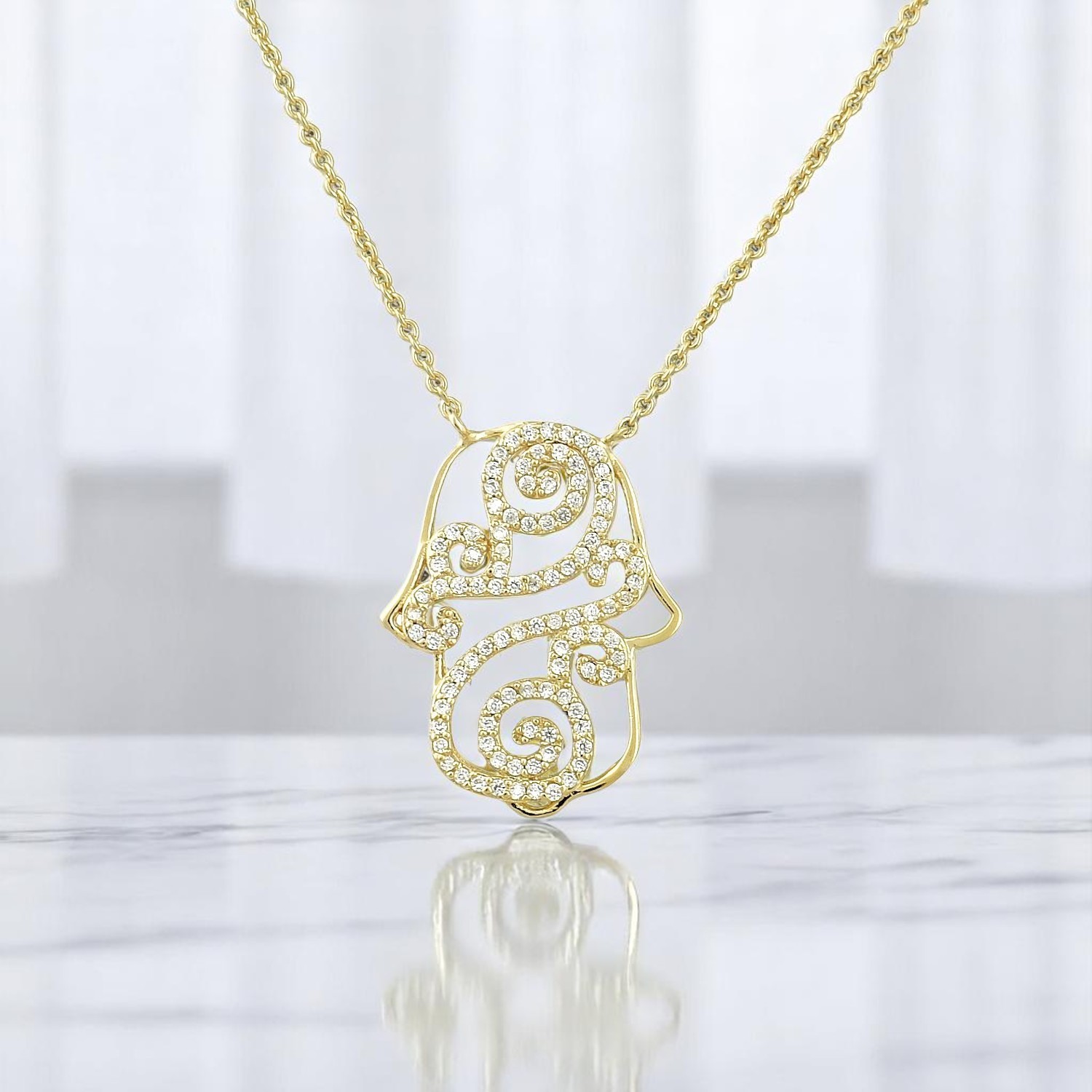 Optez pour notre sublime collier Main de Fatma Arabesque, sublimé d'oxydes de zirconium étincelants, et fabriqué avec soin en plaqué OR 750 d'une épaisseur de 3 microns.
