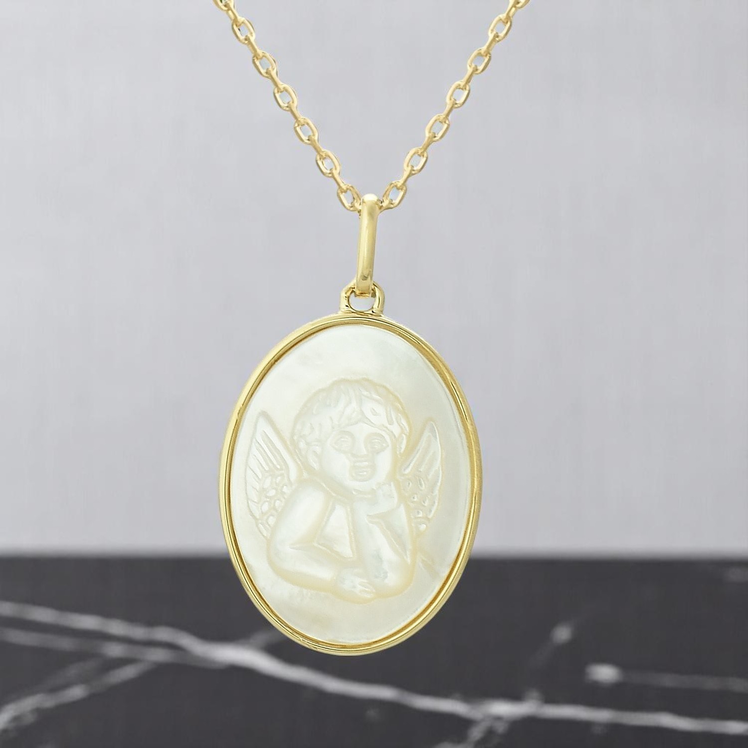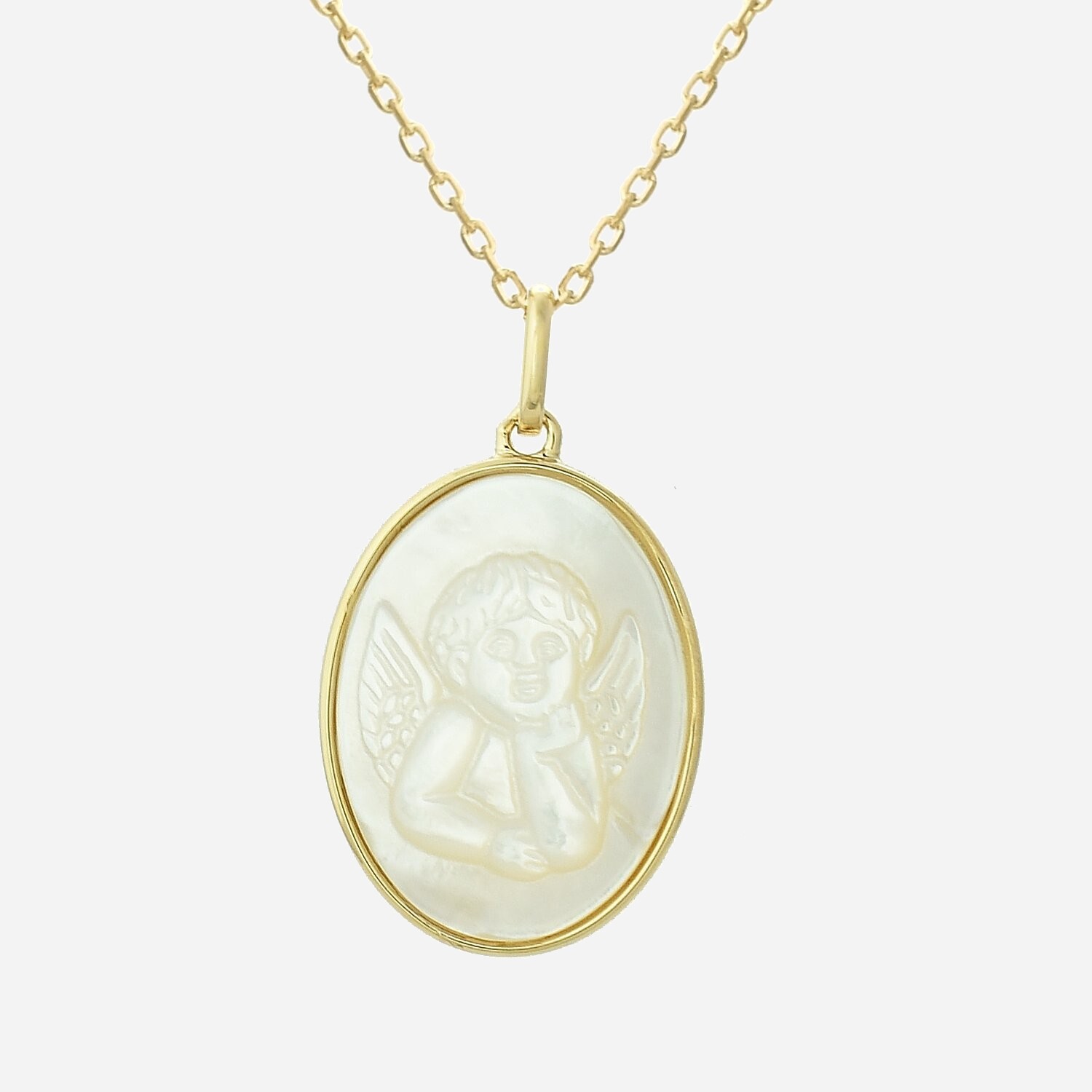 Collier médaille ange baptême nacre enfant plaqué or : protection céleste pure