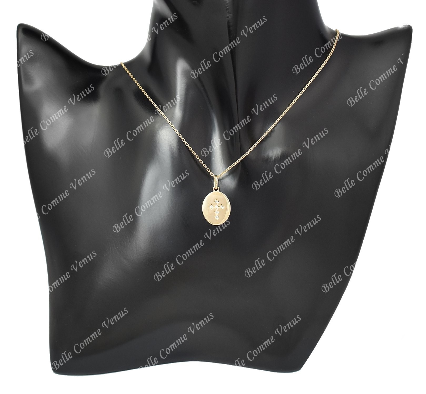 Collier médaille ovale croix oxyde zirconium plaqué or : spiritualité scintillante