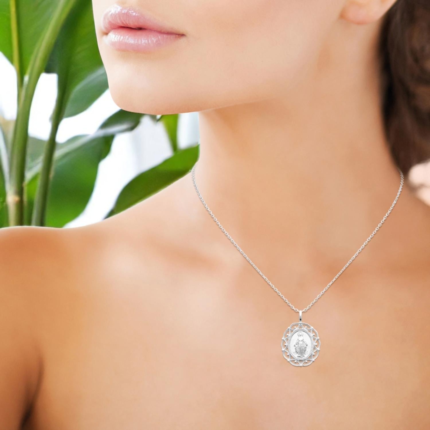Le pendentif médaillon arbore la Vierge Miraculeuse avec un motif en relief au verso, mesurant 1.6 cm de largeur sur 2 cm de hauteur.