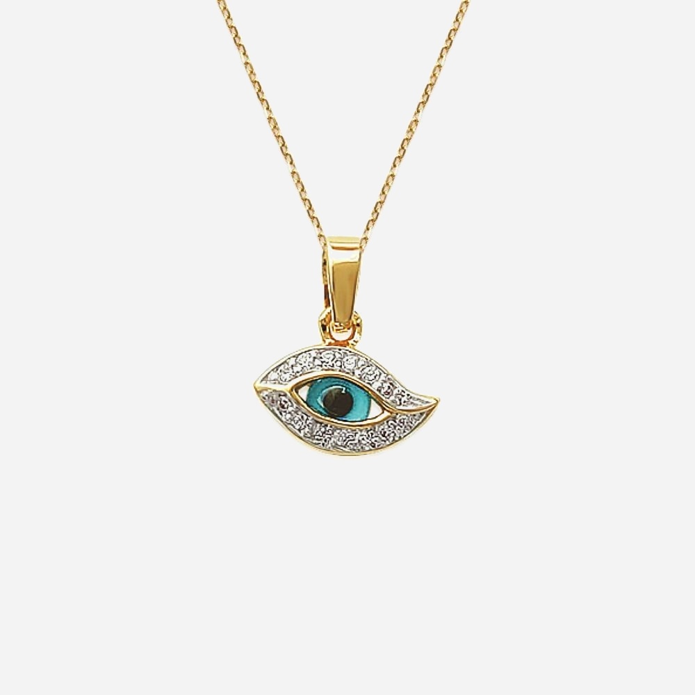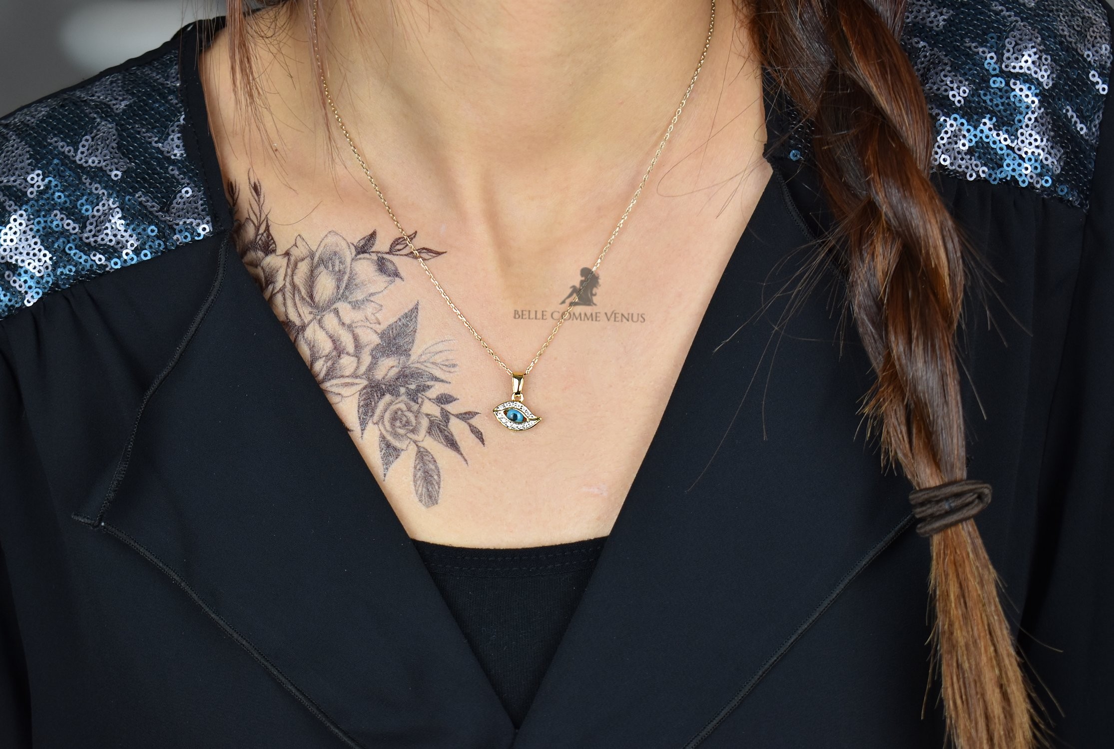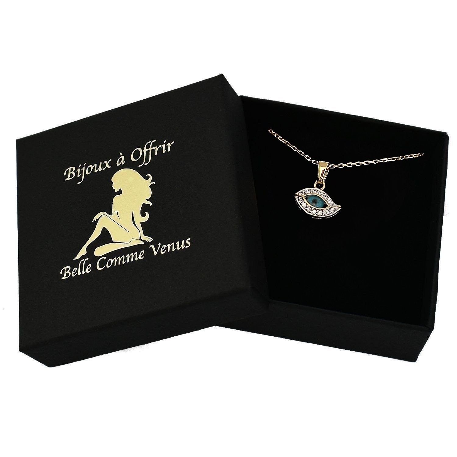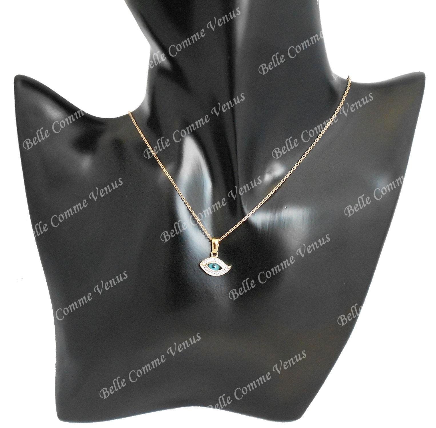 Le collier œil bleu plaqué or célèbre la protection et la chance universelle. Ce pendentif œil porte-bonheur serti d’oxydes de zirconium en plaqué or 750 3 microns 2 tons capture l’essence de la protection ancestrale dans un design raffiné et scintillant.