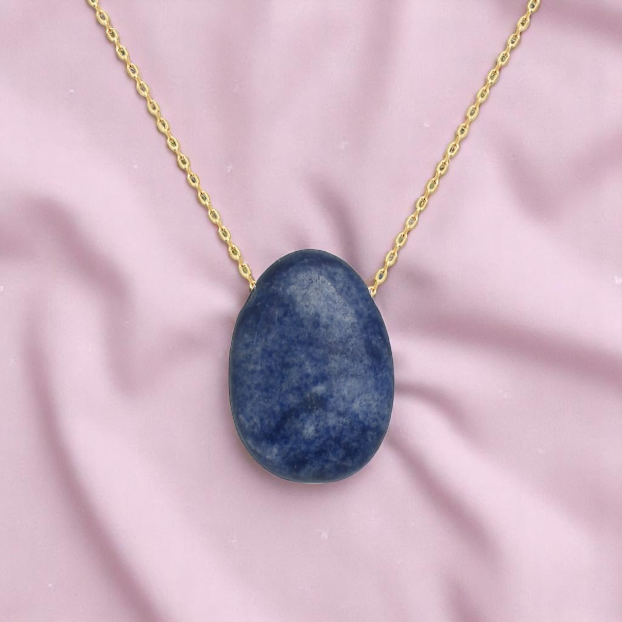 Découvrez notre magnifique collier aventurine bleue, un bijou en plaqué or 3 microns qui met en valeur une pierre naturelle d'une beauté exceptionnelle. La chaîne de 45 cm vous permet de porter ce collier avec élégance.