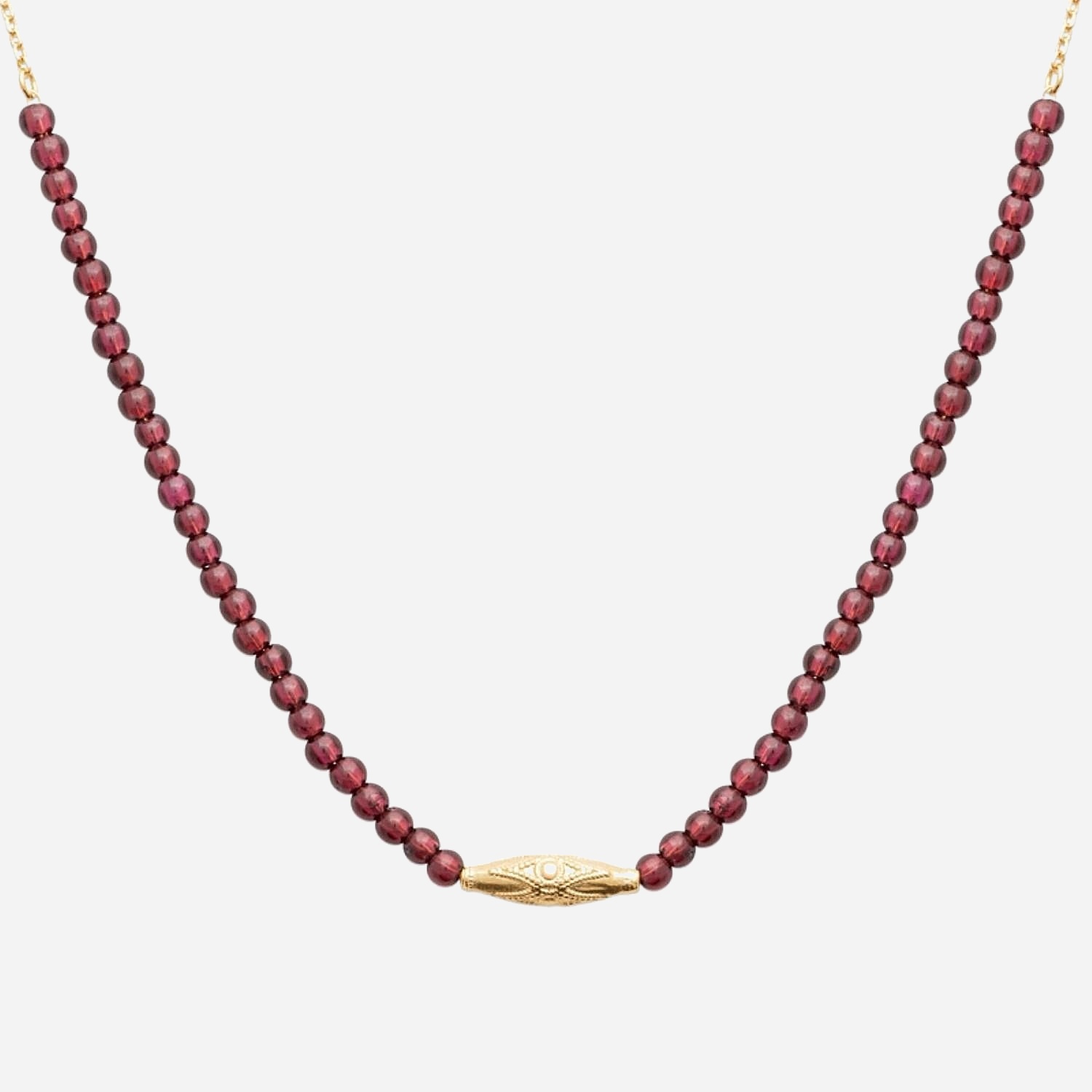 Ce collier plaqué or grenat perles célèbre la beauté intense du grenat naturel aux nuances rouge profond sublimé par un symbole géométrique raffiné. La suite de perles révèle l’éclat chaleureux de la pierre dans un écrin de plaqué or 750 3 microns, alliance sophistiquée entre puissance minérale et symbolique dorée. Une dorure haute qualité qui traverse le temps avec éclat.