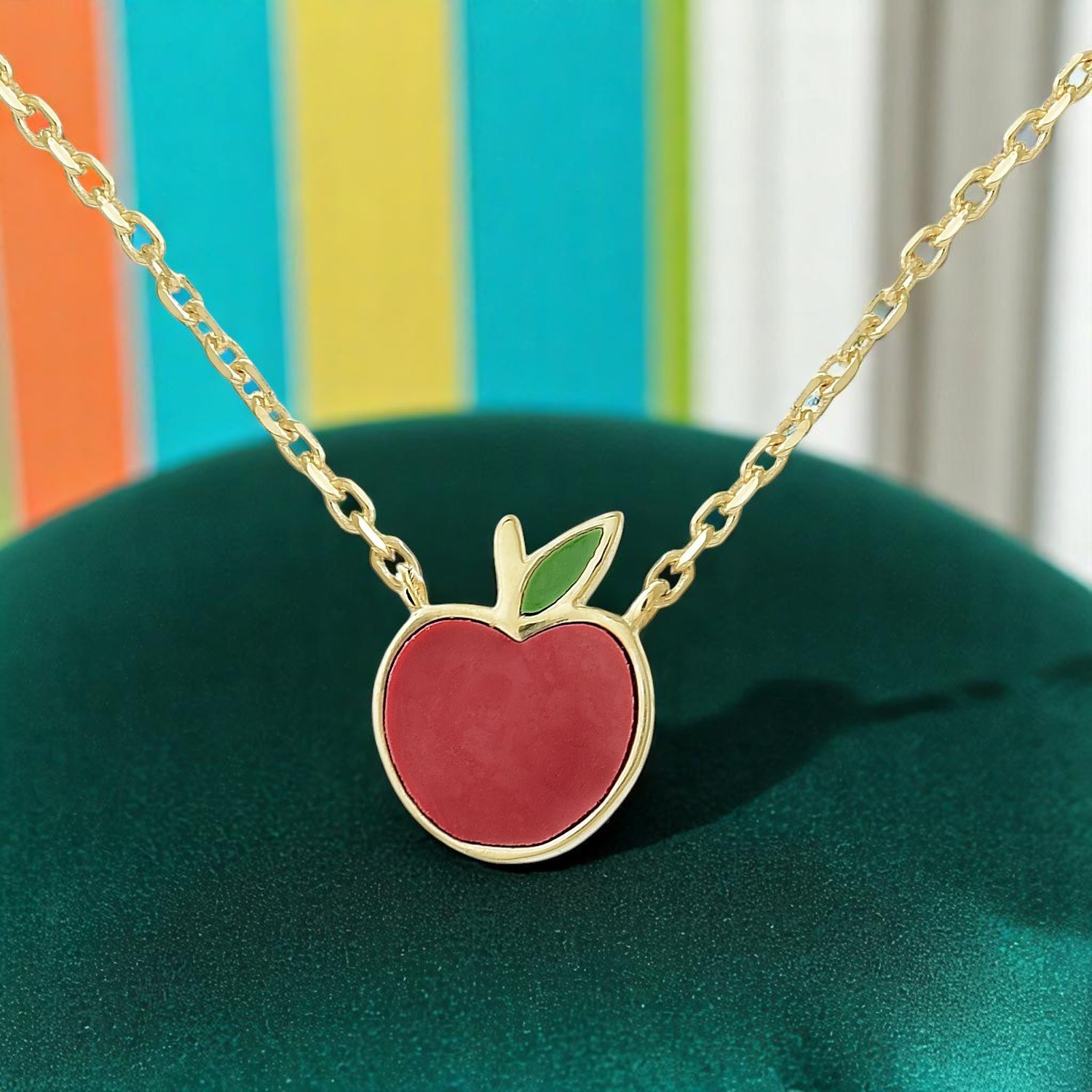 Collier pomme plaqué or émail rouge vert enfant : fraîcheur croquante au cou