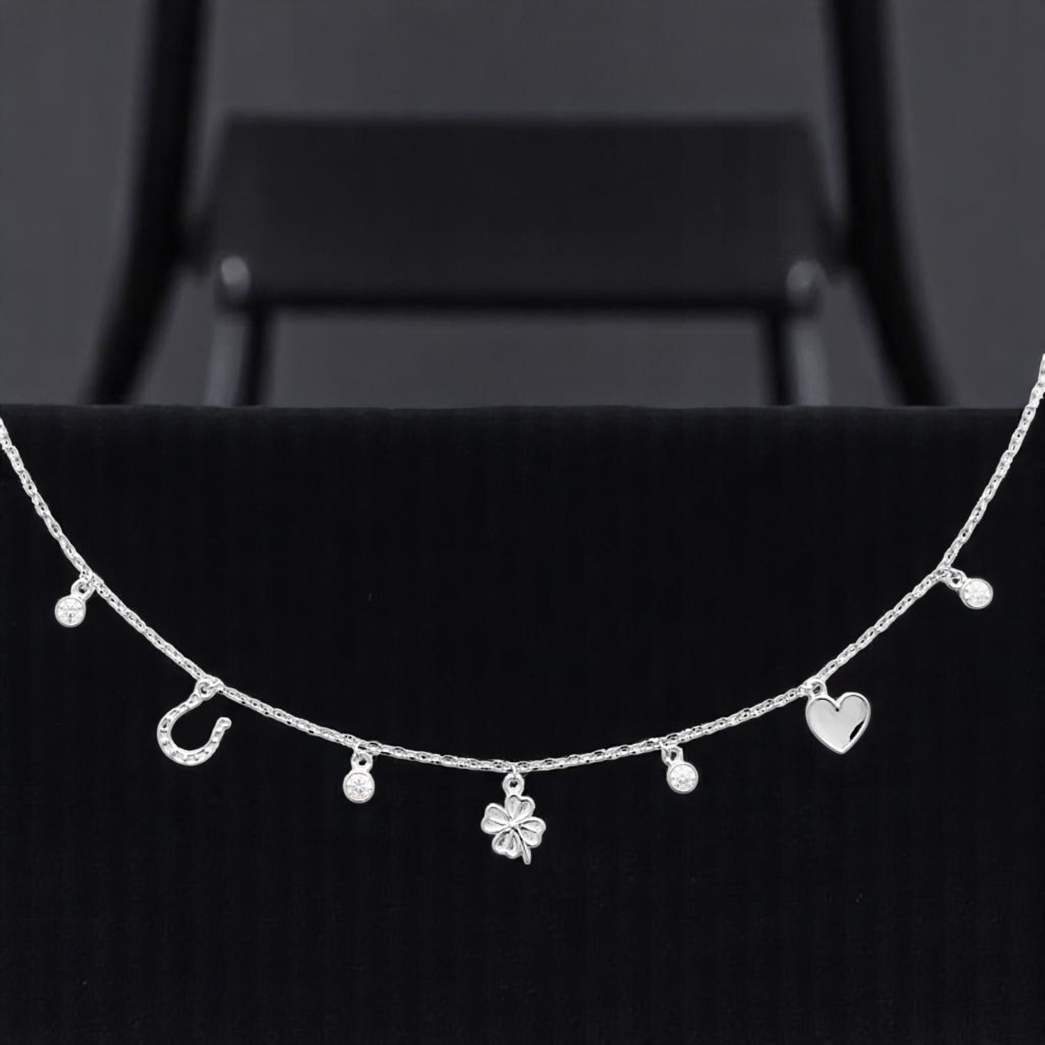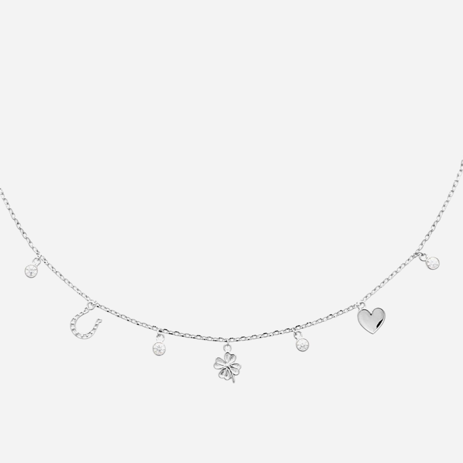 Collier Porte Bonheur Chance Argent 925 Rhodié Cœur Trèfle Fer à Cheval Oxydes Zirconium