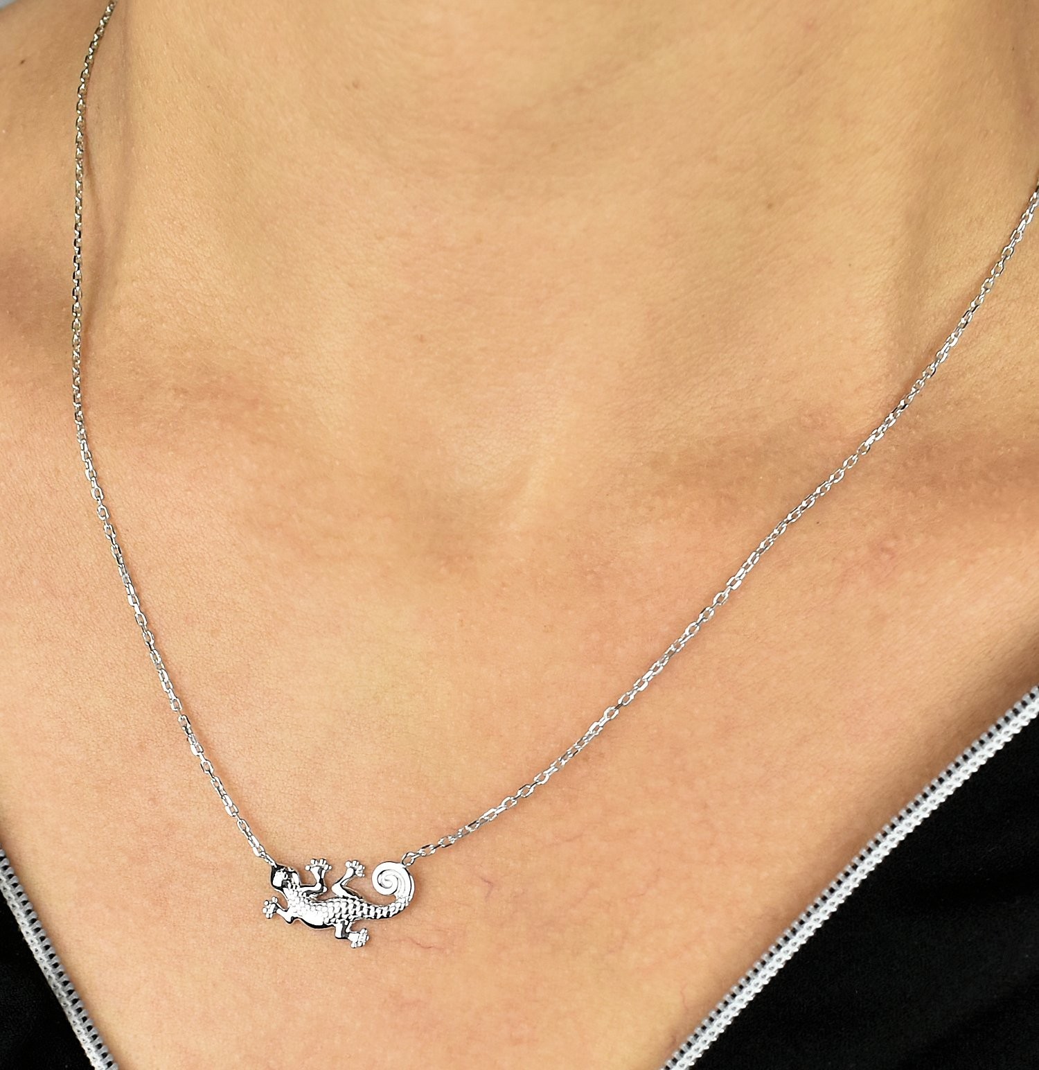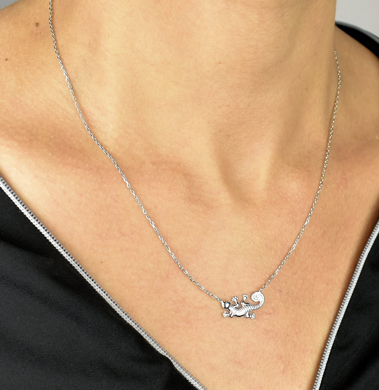 La salamandre finement ciselée en argent 925 rhodié suspendue à votre cou. Cette créature légendaire traverse les mythologies comme symbole puissant de transformation, de régénération et de capacité à traverser les épreuves.