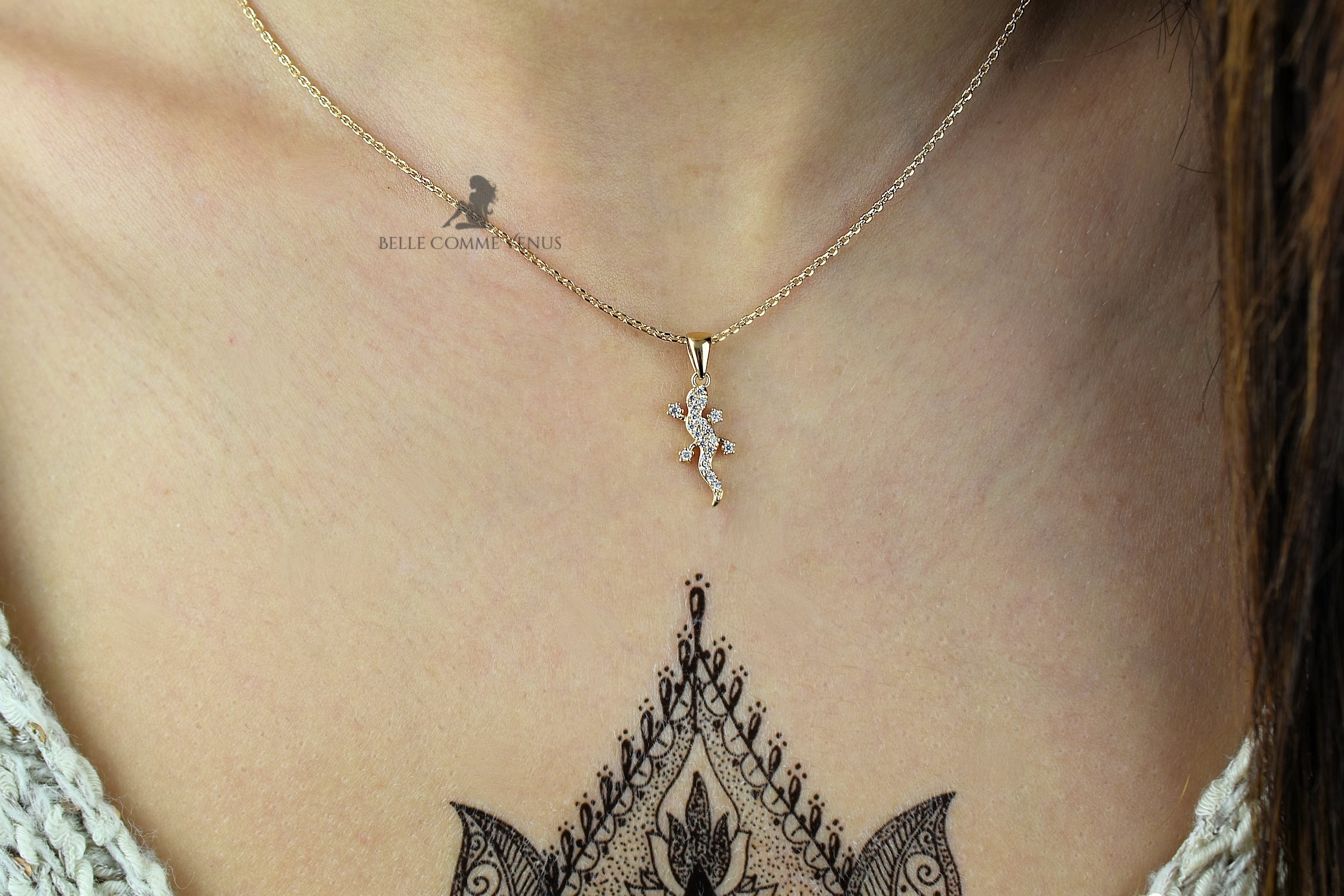 Le collier salamandre lézard plaqué or 750 serti d’oxyde de zirconium célèbre le reptile fascinant symbole de transformation, renaissance et adaptabilité. La salamandre, créature mythique et mystique, incarne le renouveau et la capacité à se régénérer dans de nombreuses cultures ancestrales.