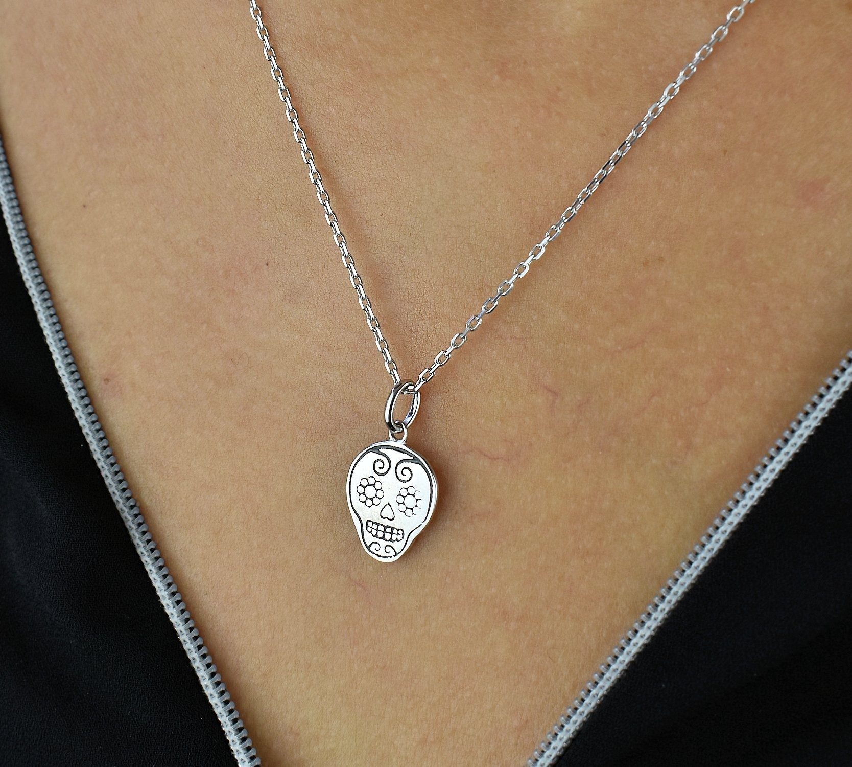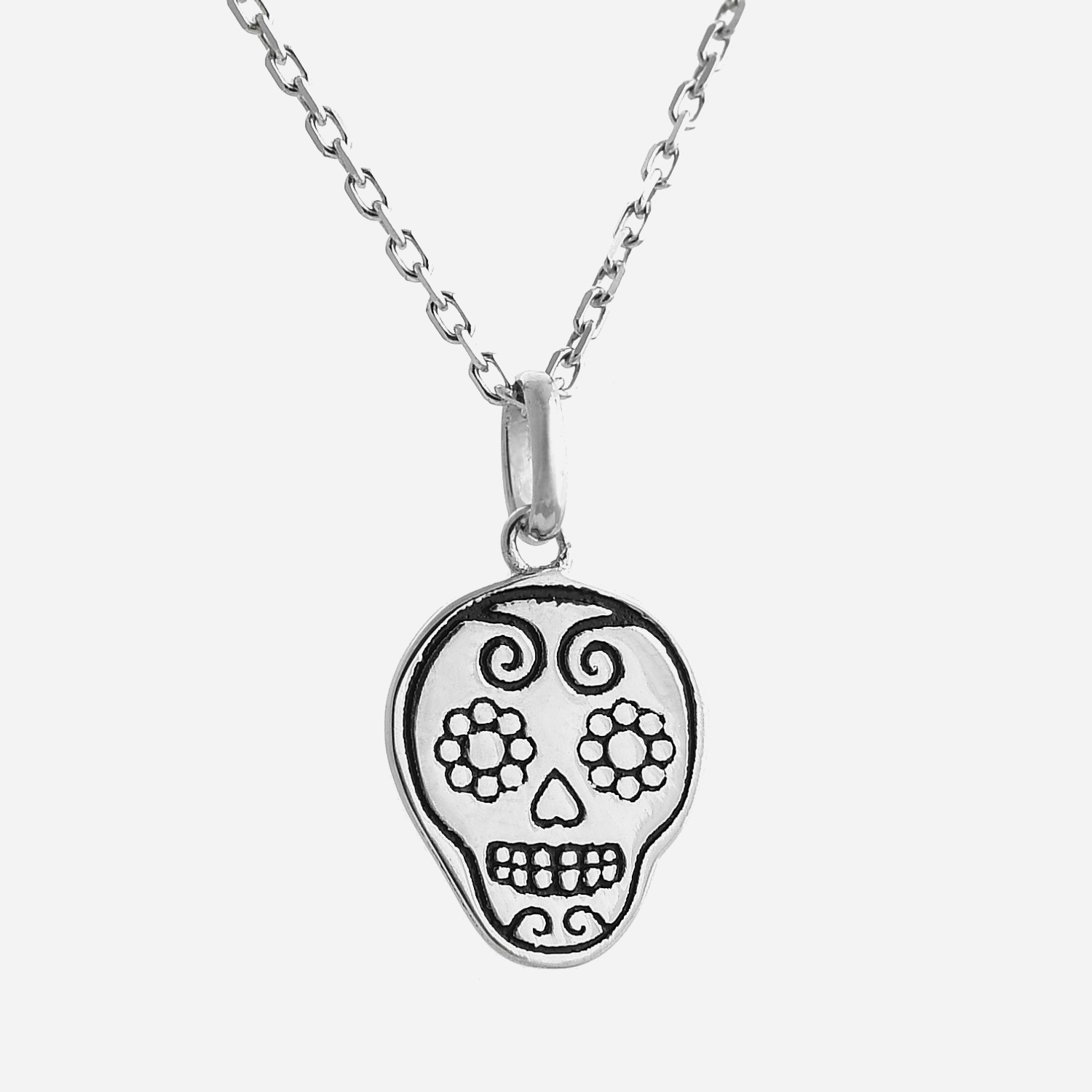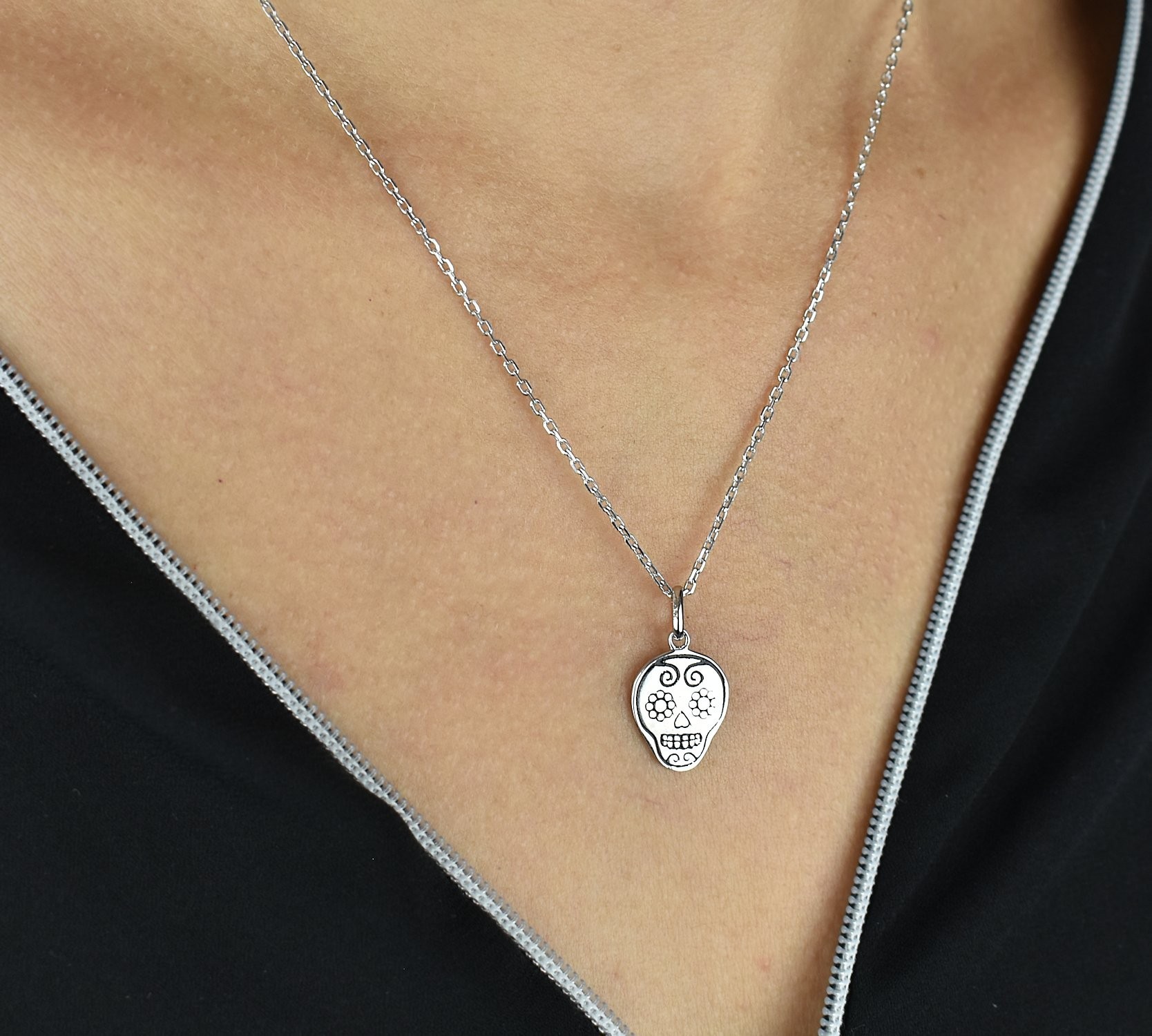 Ce collier tête de mort argent 925 rhodié revisite l’iconique calavera mexicaine avec une touche florale délicate. La finition rhodiée protège l’argent et garantit un éclat miroir durable.