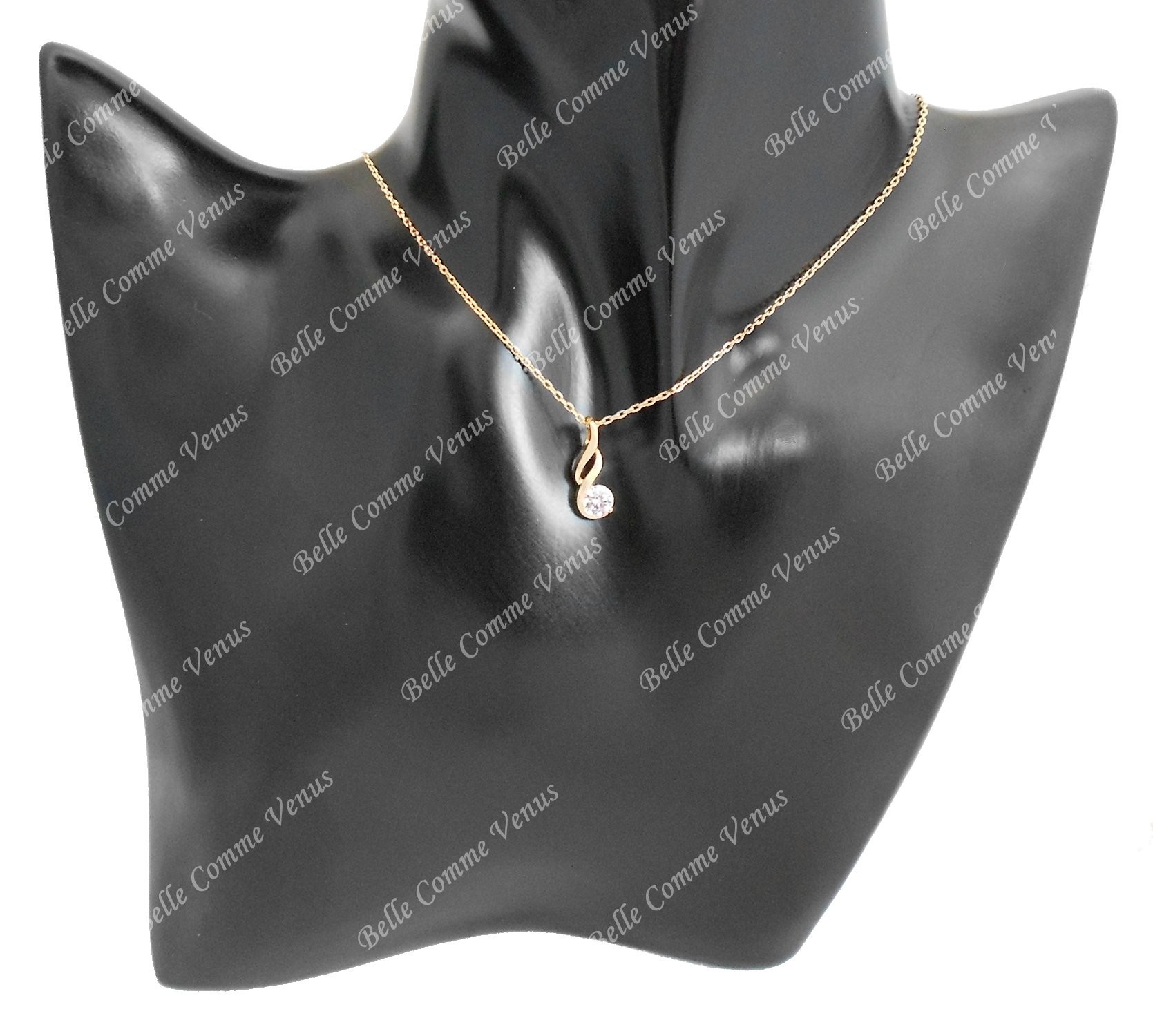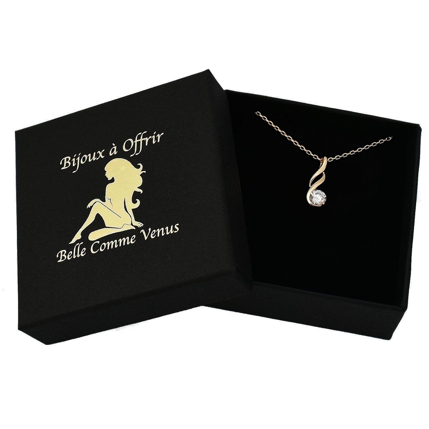 La torsade délicate crée un jeu de courbes gracieux rehaussé par les zirconiums étincelants qui captent la lumière dorée. Le plaqué or 3 microns garantit un éclat durable à ce bijou sophistiqué qui sublime le décolleté avec finesse et brillance précieuse.