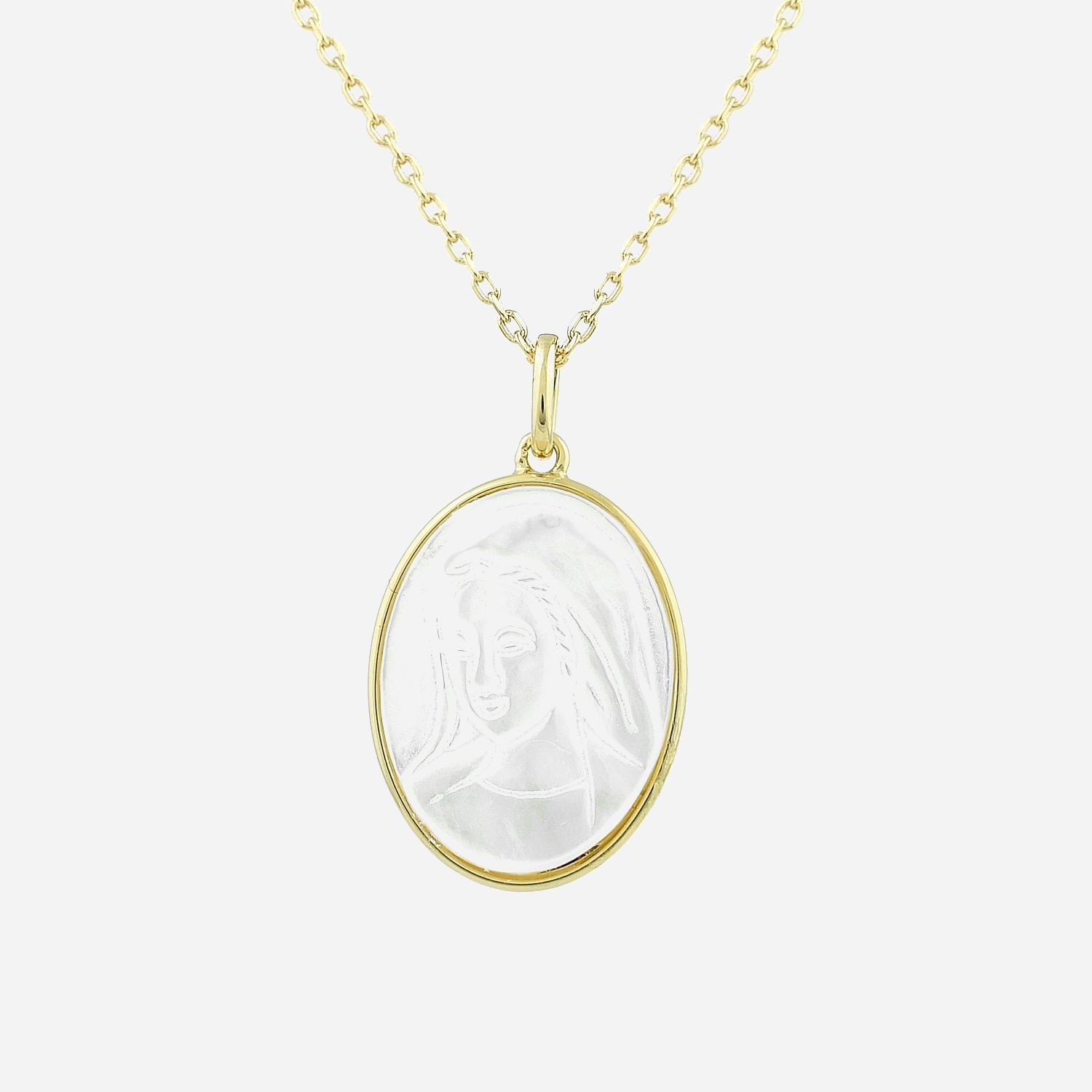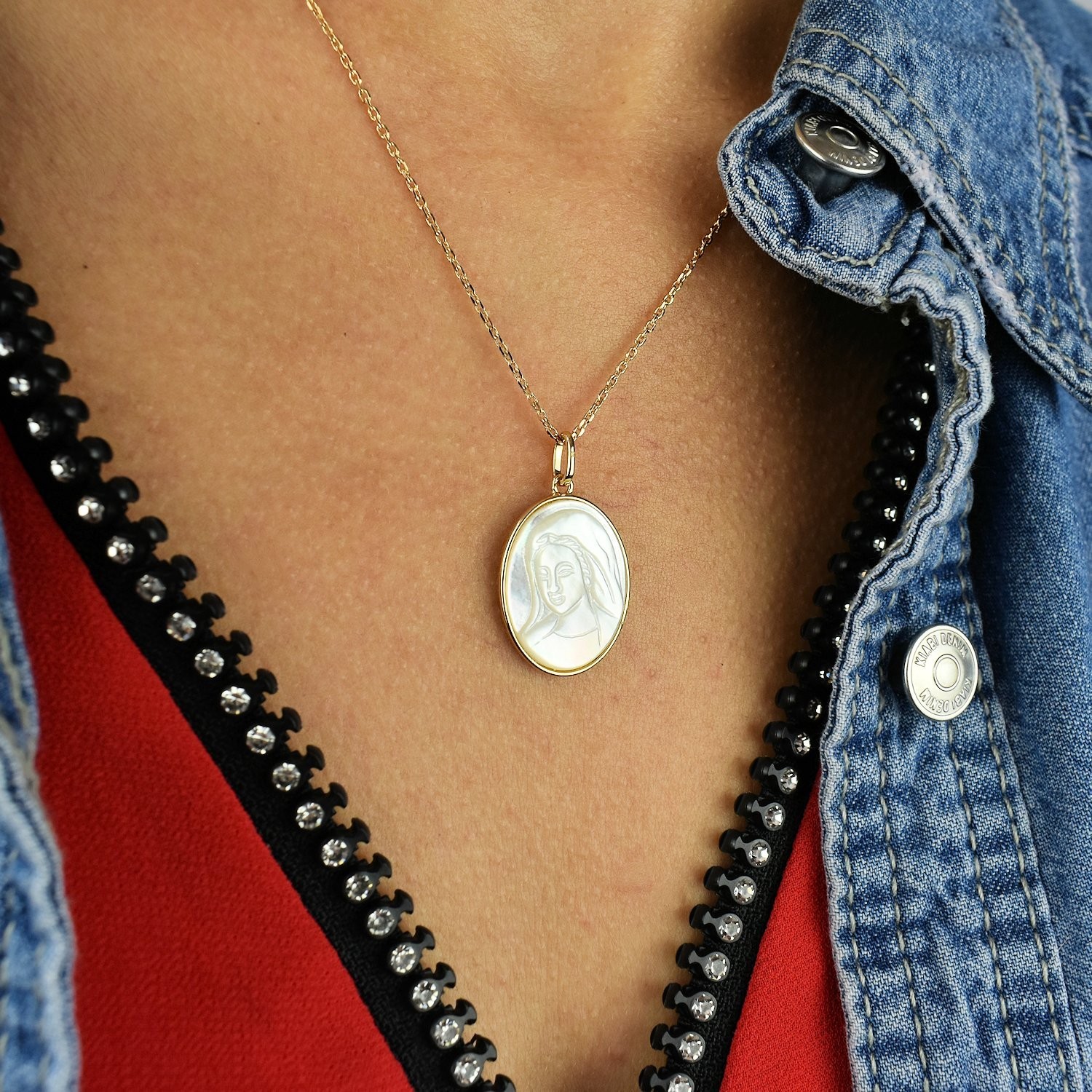 Ajoutez une touche de spiritualité et de beauté à votre style avec ce superbe collier Vierge Marie médaille ovale de nacre plaqué en OR 750 3 microns. Portez-le en signe de dévotion ou comme un symbole de protection.