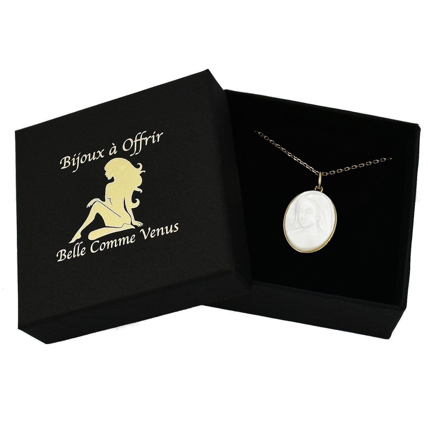 Découvrez notre magnifique collier Vierge Marie avec une médaille ovale en nacre, plaquée en OR 750 3 microns.