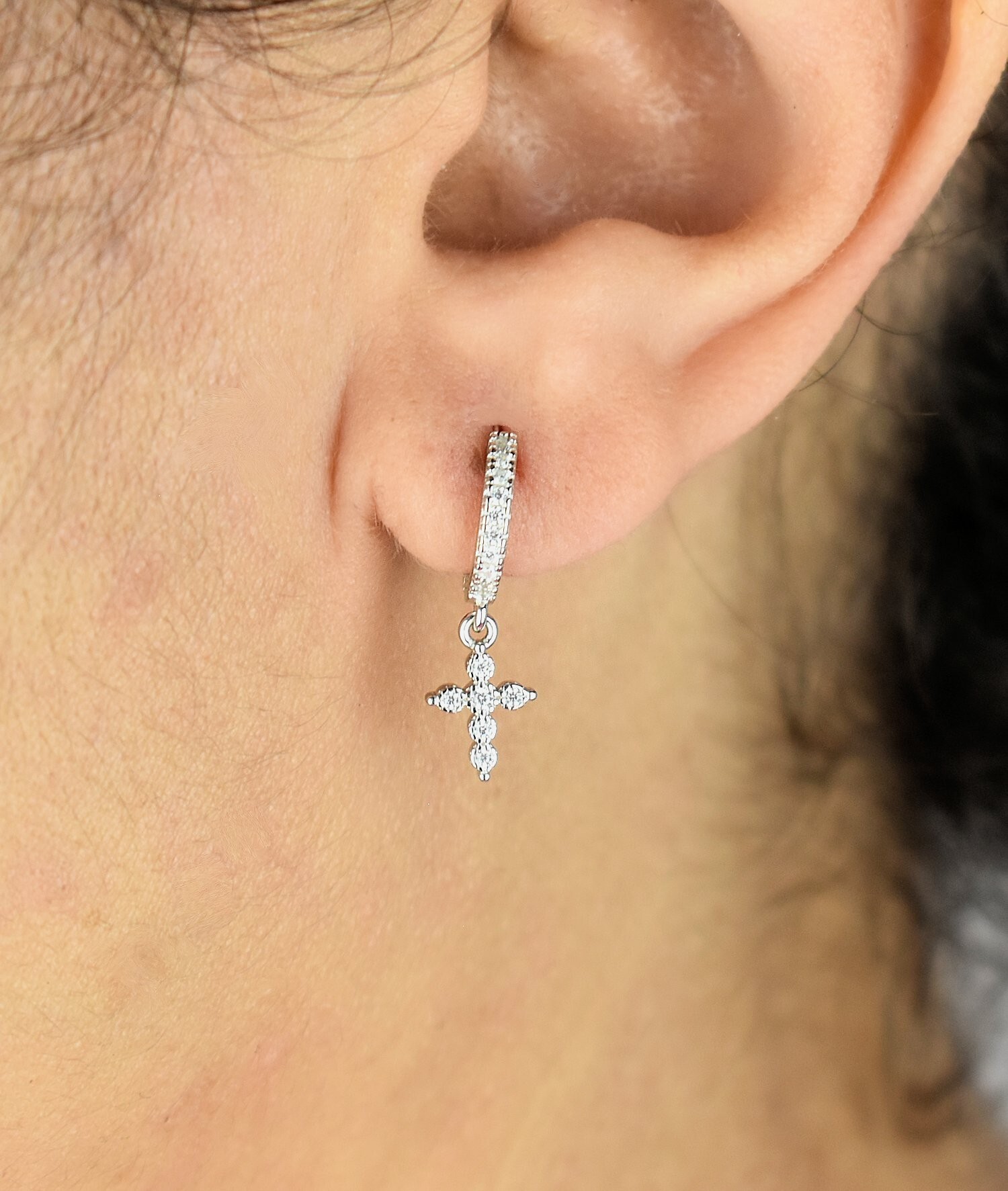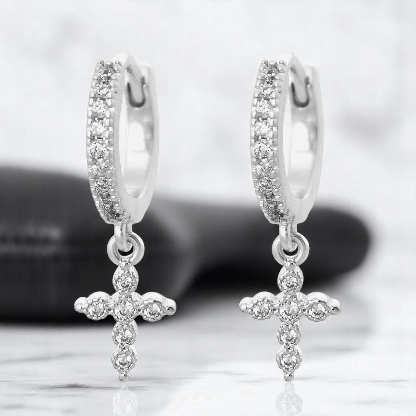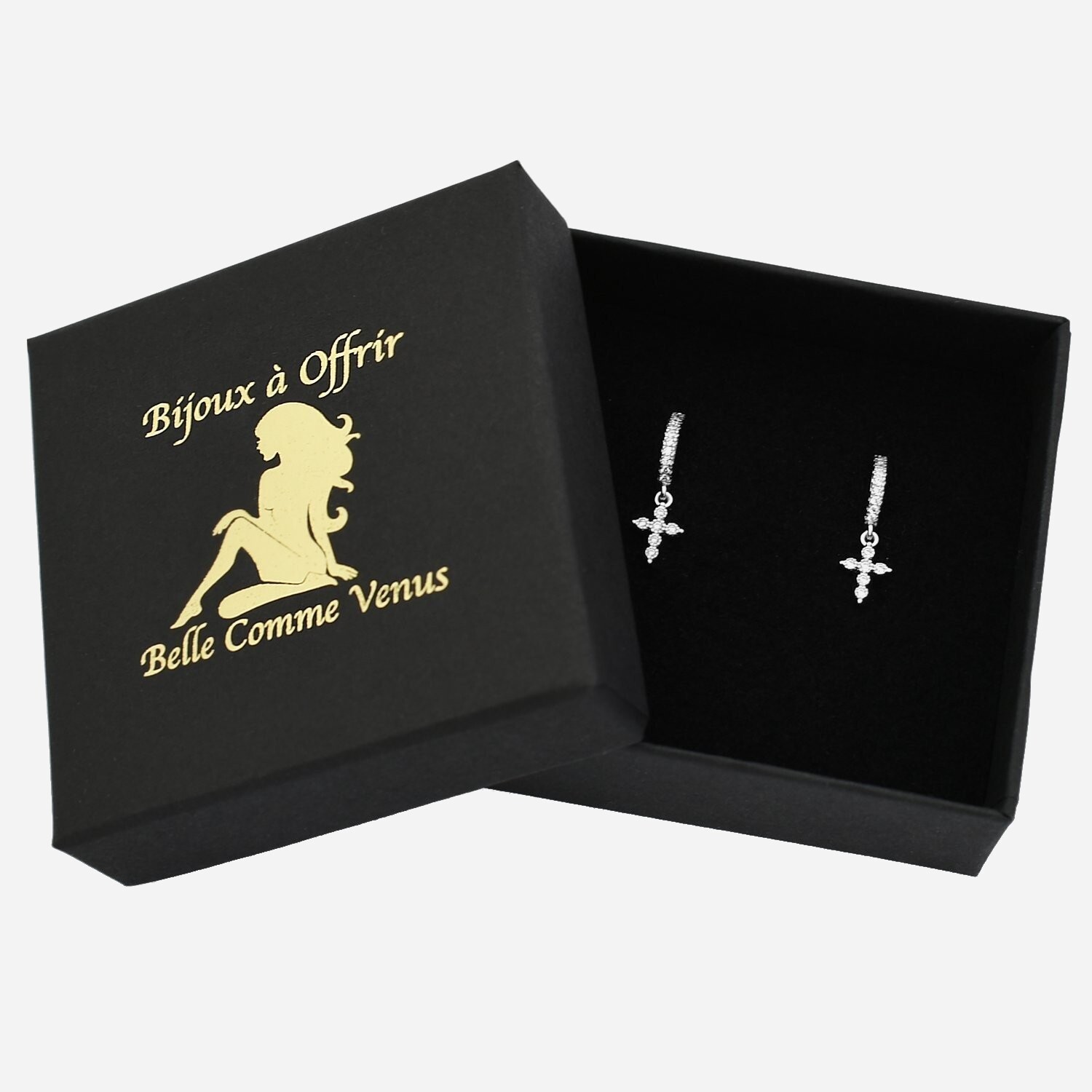 Boucles d’oreilles Mini Créoles Croix Argent 925 Rhodié – Pendentif Oxyde de Zirconium Protecteur