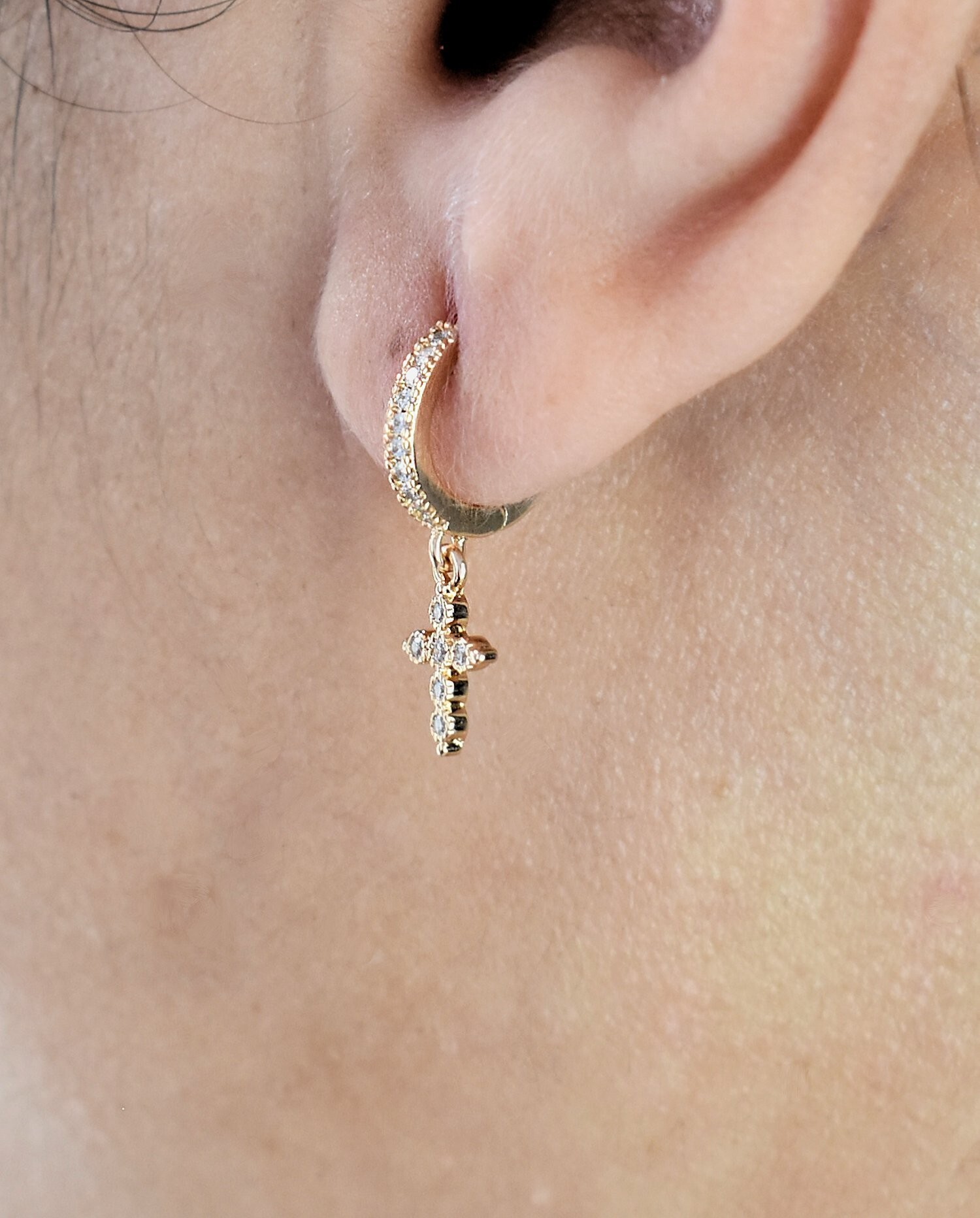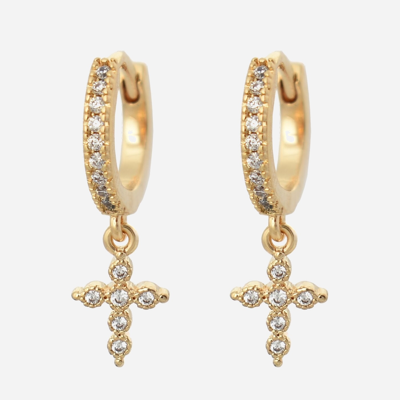Boucles d’oreilles Mini Créoles croix oxyde de zirconium pendante Plaqué or 750 3 microns