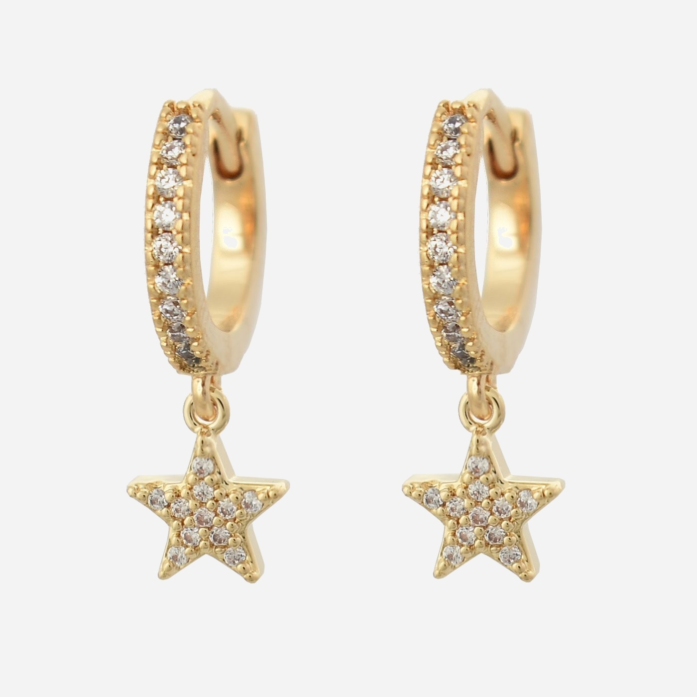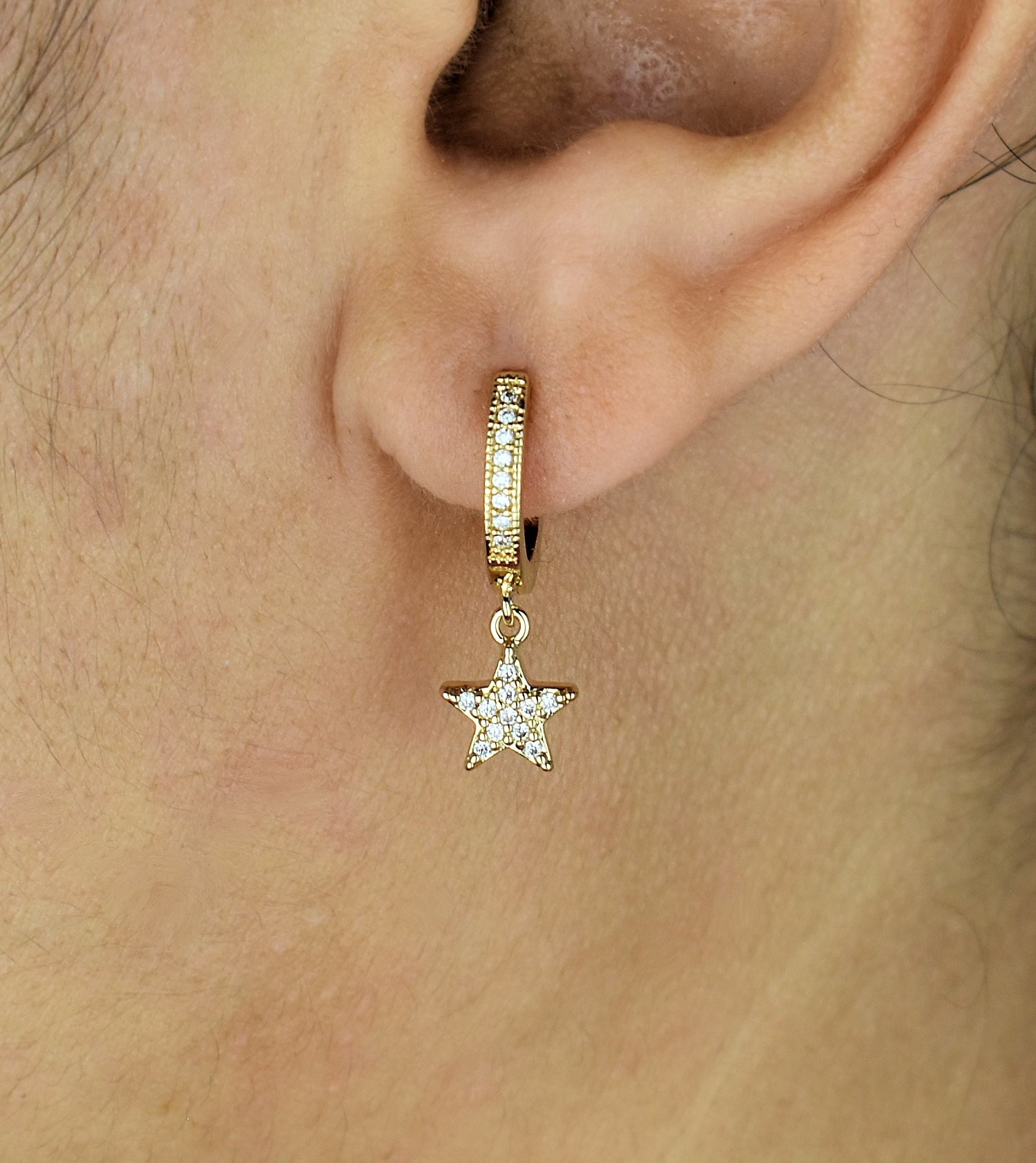 Diamètre de la créole sertie d’oxydes de zirconium : 1.2 cm, Hauteur totale avec pampille étoile pendante : 2 cm