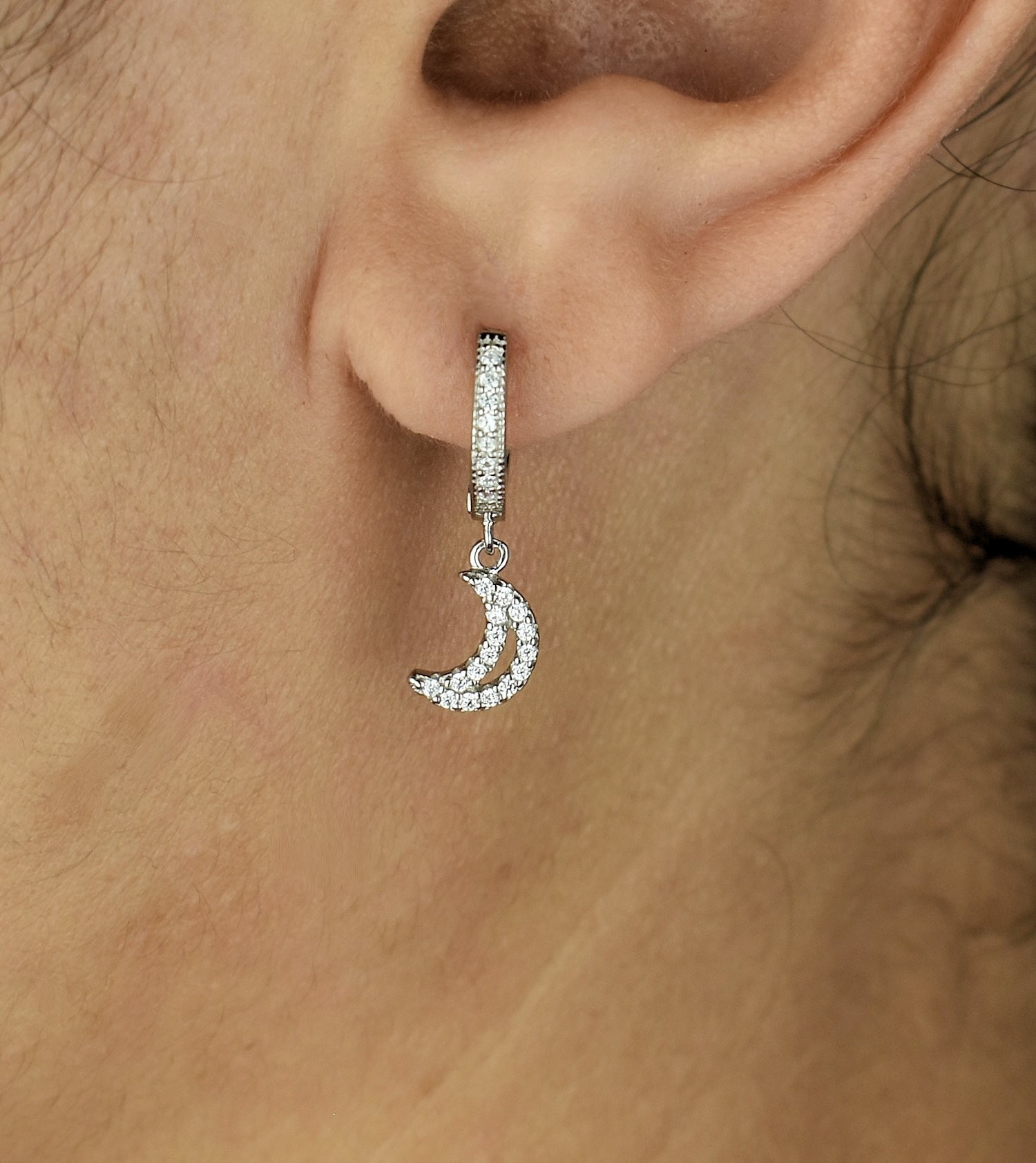 Les mini créoles apportent légèreté tandis que la lune pendante en oxyde de zirconium scintille délicatement. L’argent 925 rhodié garantit brillance durable. Des boucles qui subliment le visage avec finesse lunaire et finition joaillière précieuse pour un style céleste au quotidien.