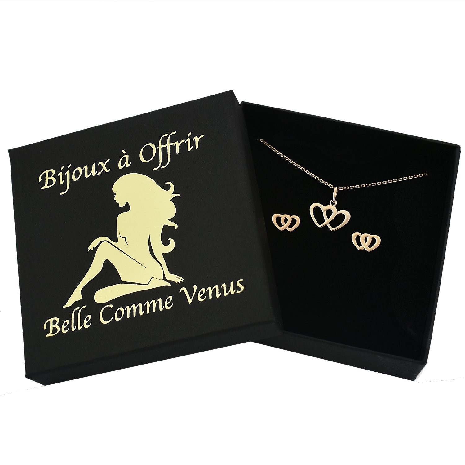 Les 2 cœurs enlacés symbolisent union et complicité, sublimés par le travail ajouré qui apporte légèreté. Le plaqué OR 750 3 microns garantit brillance dorée luxueuse durable. Une parure complète qui affirme romantisme avec finesse dorée et finition joaillière précieuse pour un message d’amour précieux.