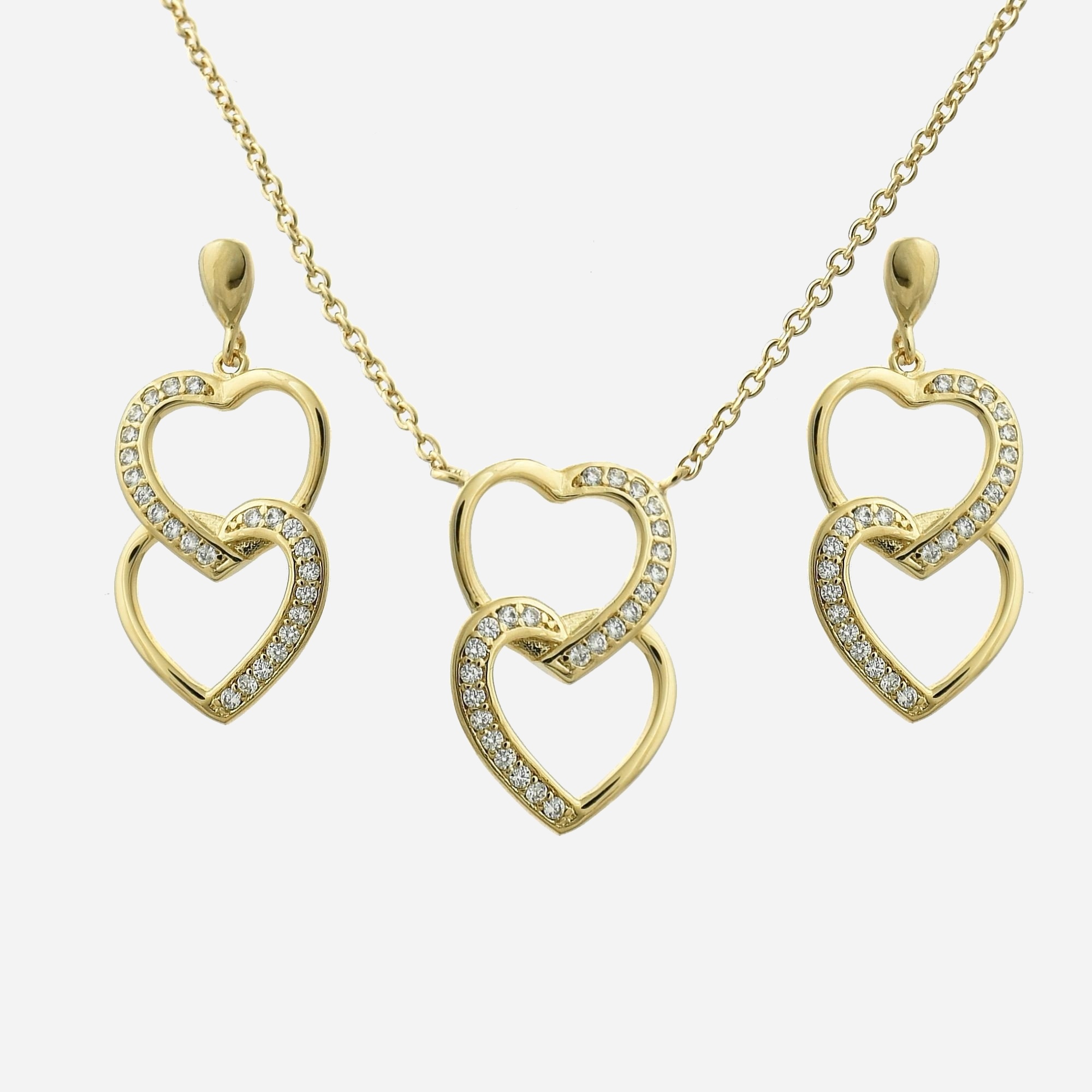 La parure 2 coeurs plaqué or 750 avec oxydes de zirconium crée un ensemble harmonieux et élégant. Le coeur, symbole universel de l’amour et de la vie, se décline en double superposition raffinée dans cette parure complète.