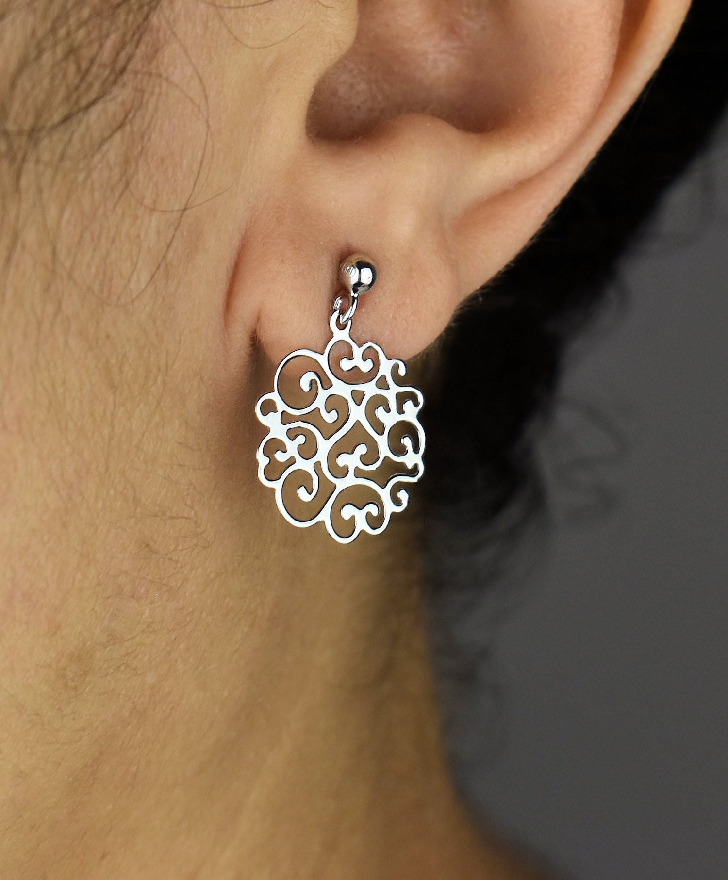 Une parure complète où se dessinent des arabesques et des coeurs entrelacés en argent 925 rhodié. Cette dentelle argentée coordonnée crée un mouvement fluide et poétique du collier aux boucles d’oreilles, comme une calligraphie amoureuse ciselée.