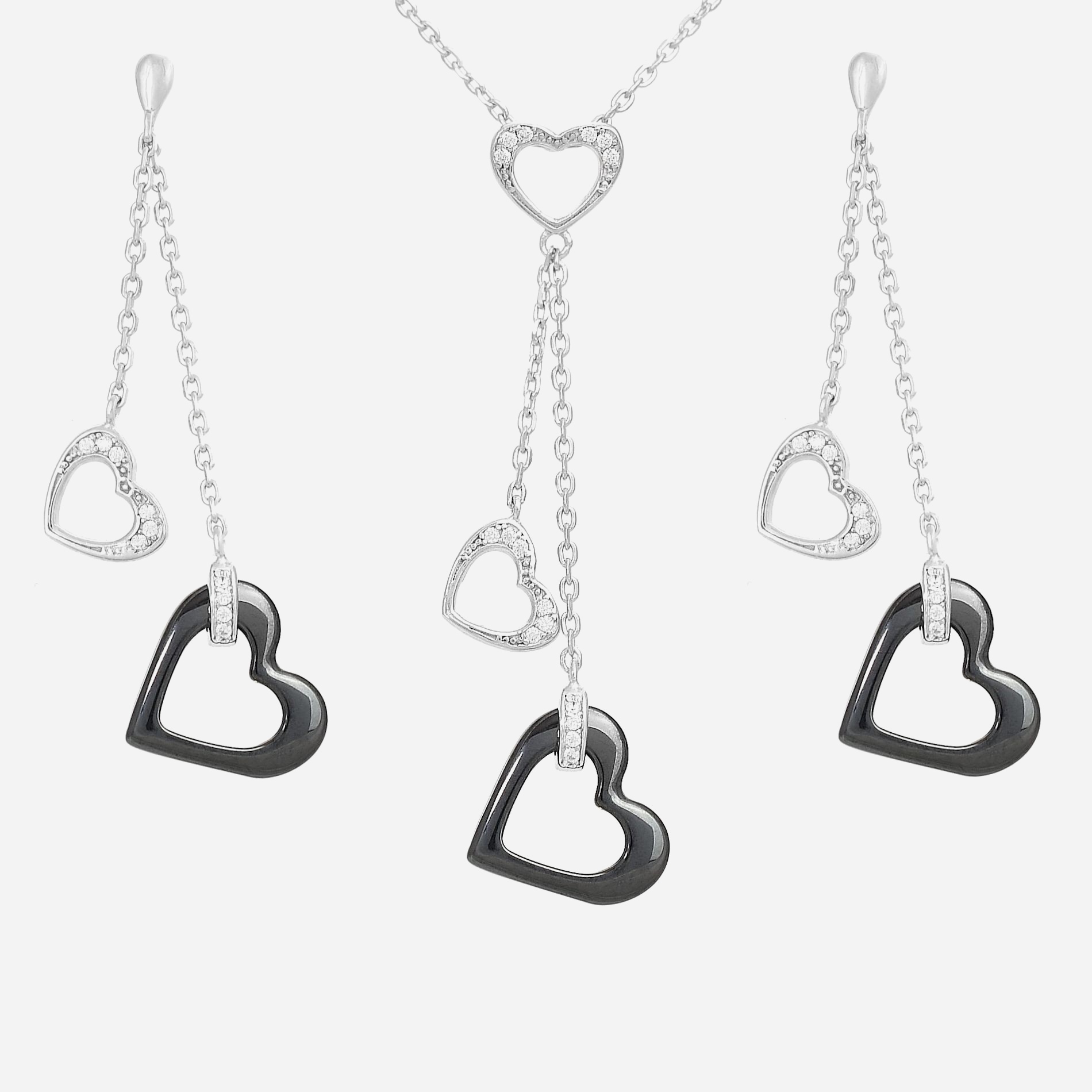 Parure Cœurs Oxyde de Zirconium et Céramique Noire Argent 925 Rhodié Contraste Moderne