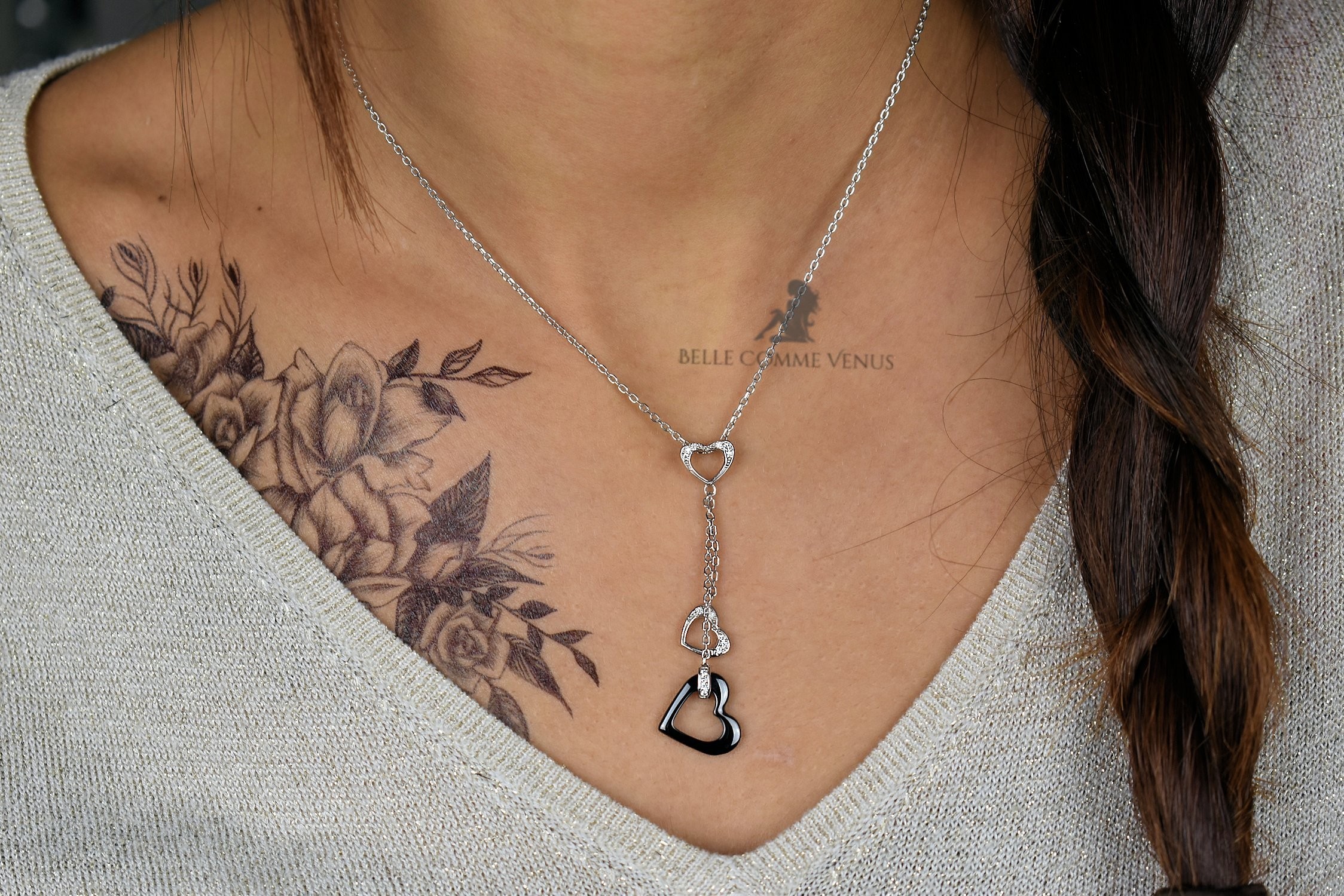 Cette parure coeurs conjugue symbolique affectueuse et sophistication bicolore contemporaine. Les cœurs représentent amour et tendresse tandis que le contraste céramique noire et oxydes de zirconium apporte modernité audacieuse. L’argent 925 rhodié garantit éclat résistant, créant une parure complète qui célèbre l’amour avec élégance moderne et raffinement contrasté.