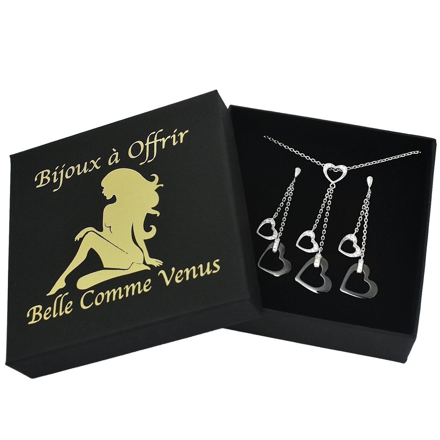 Parure coeurs oxyde zirconium céramique noire argent 925 : amour contrasté moderne
