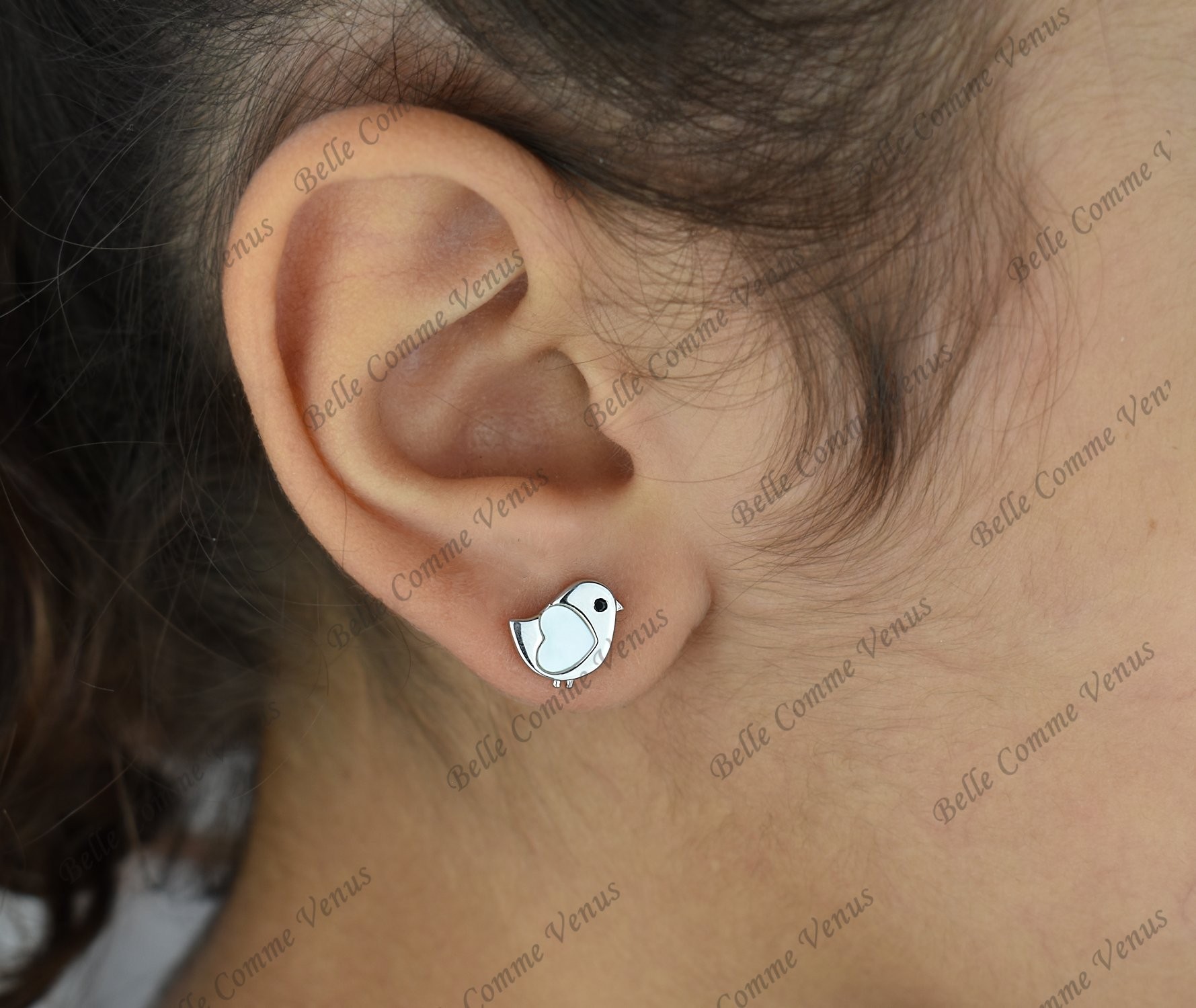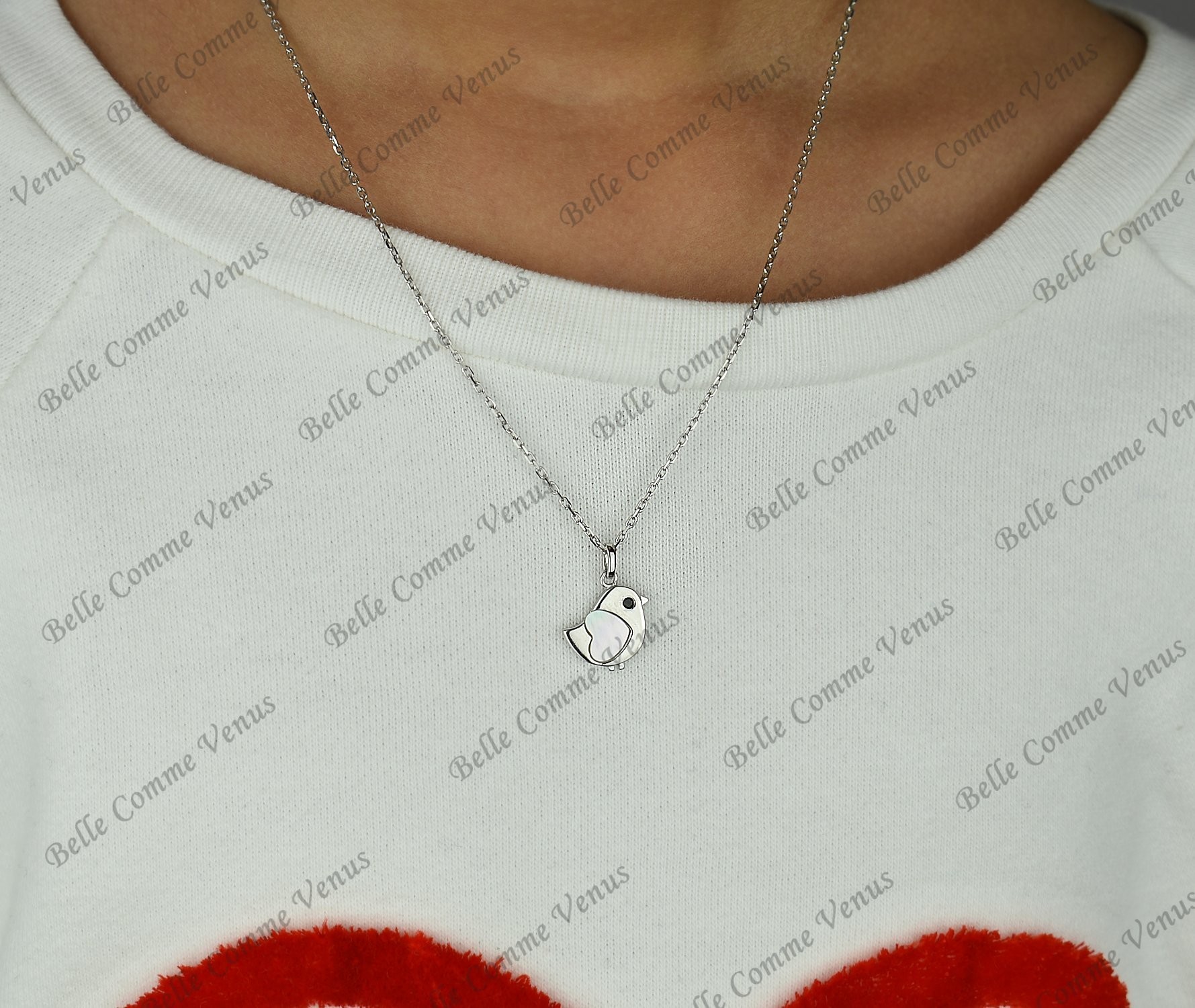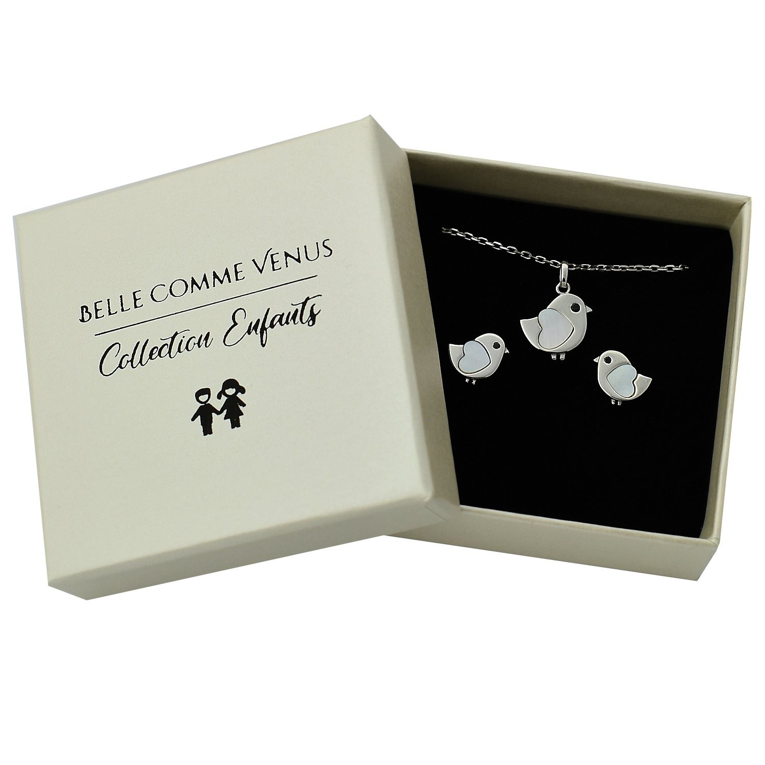 L’argent 925 rhodié est hypoallergénique et parfaitement adapté aux enfants. Le cœur de nacre apporte douceur irisée tandis que l’œil en zirconium noir donne vie à l’oiseau. Une parure complète qui traverse les années sans ternir, avec finition joaillière précieuse et matériaux nobles.